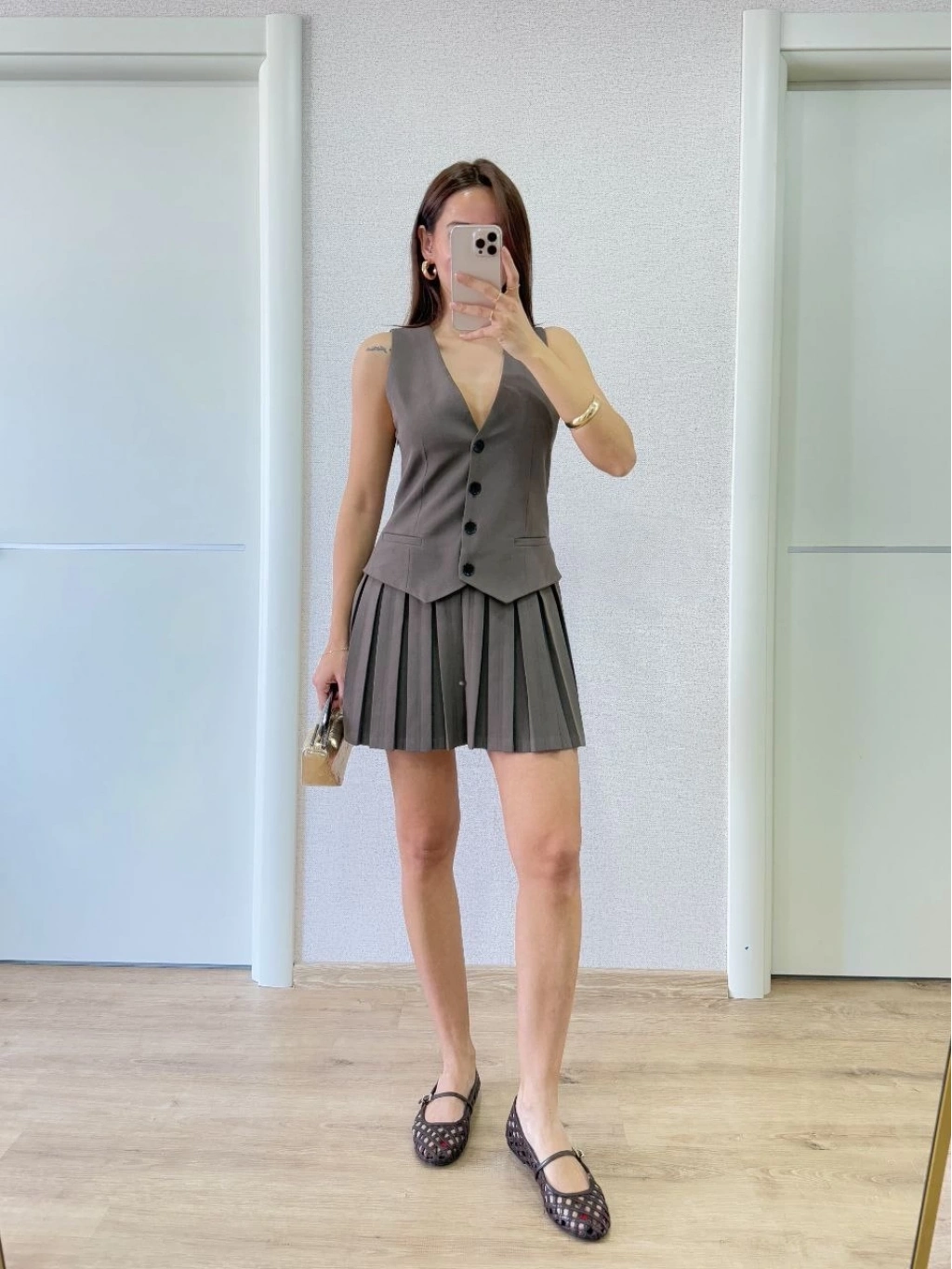 Keten Takım Görünümlü Düğme Detaylı Yelekli Mini Elbise - Füme -