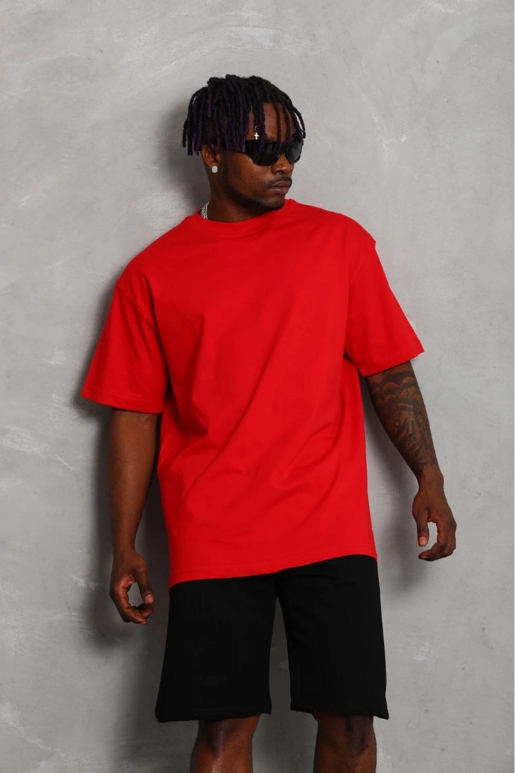 Oversize Düz Bisiklet Yaka T-Shirt - Kırmızı -