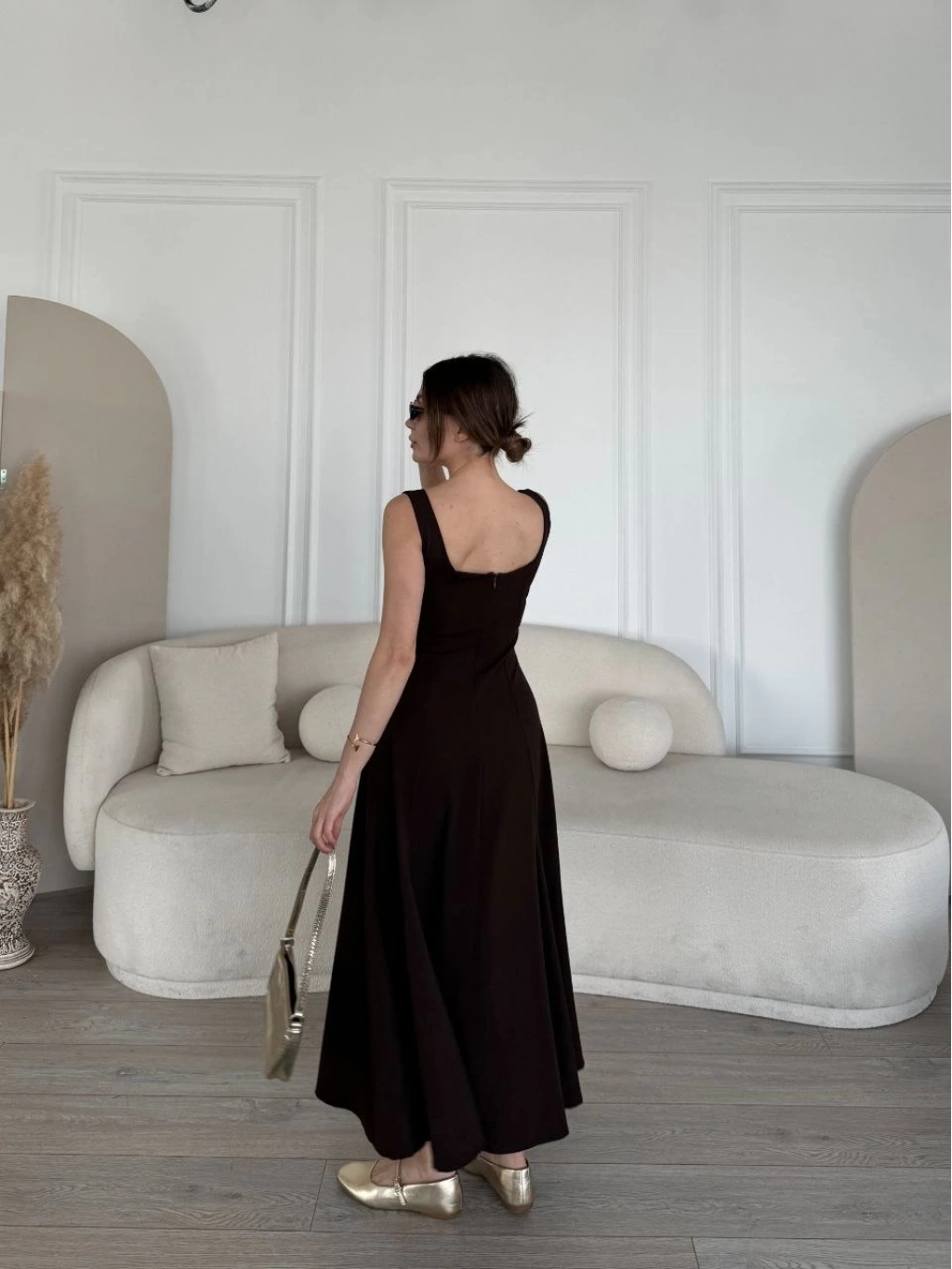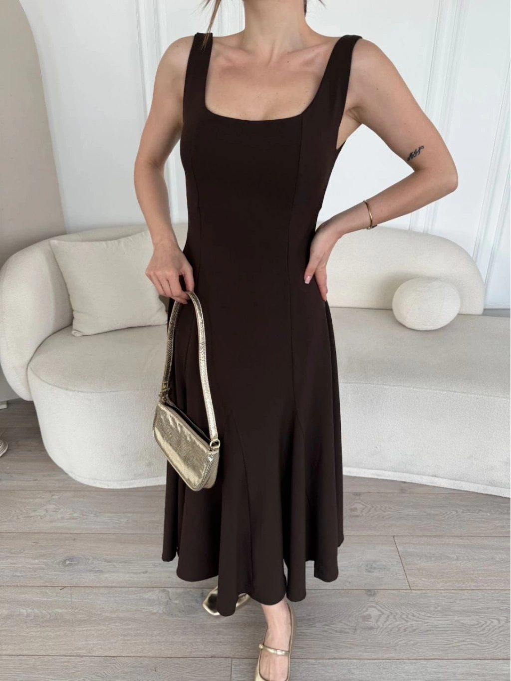 Sırt Dekolteli Kolsuz Uzun Elbise - Kahverengi -