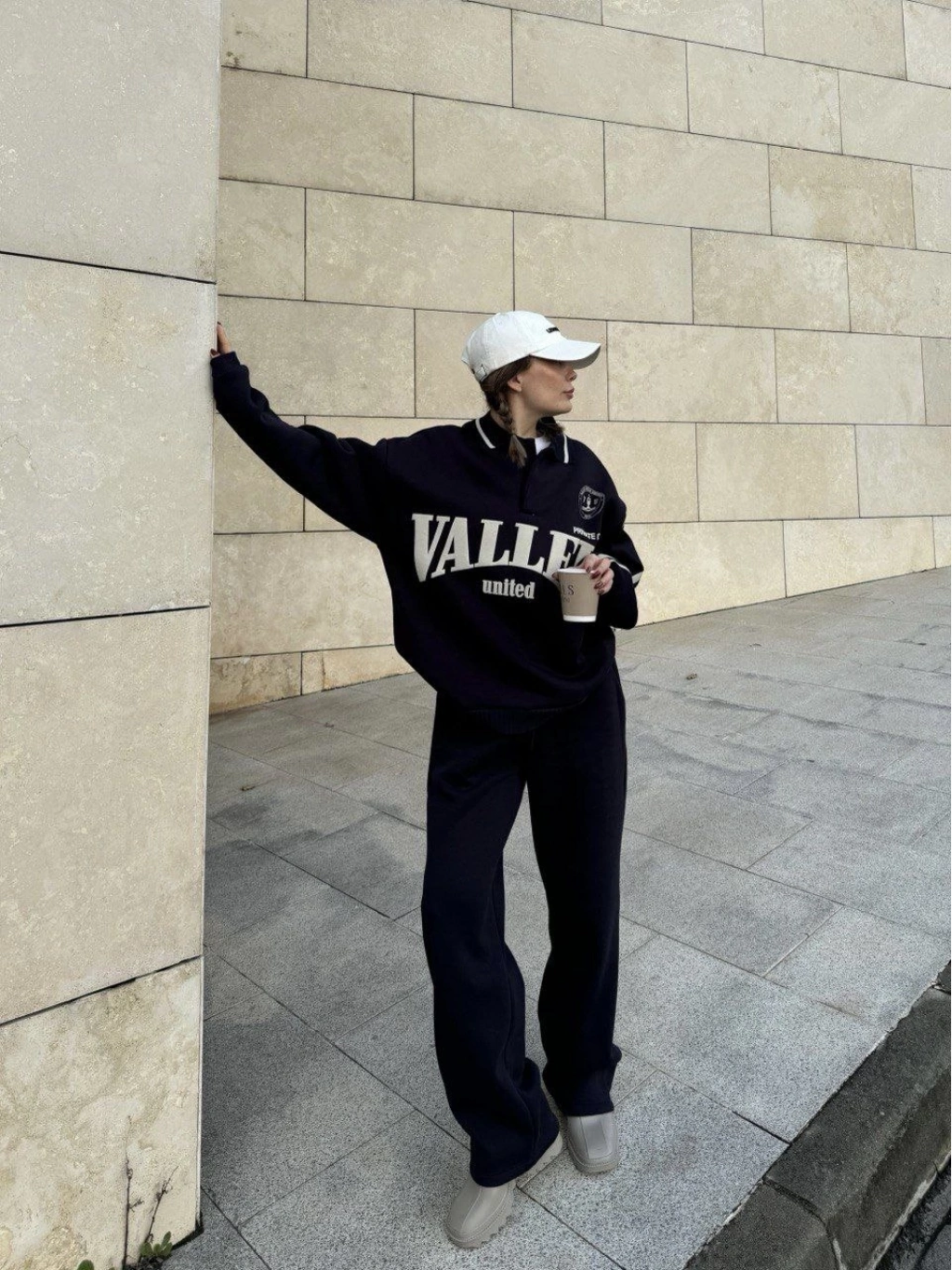 Üç İplik Yakalı Sweat Baggy Pantalonlu Takım - Siyah -