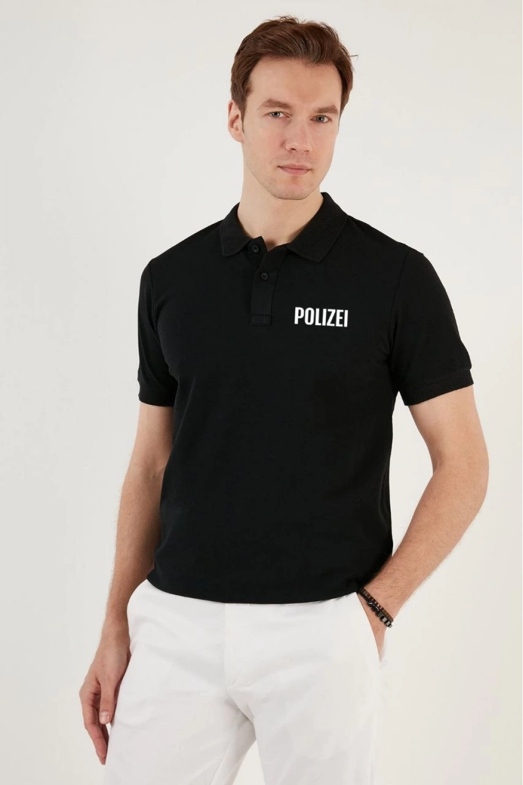 Yakası Düğmeli Yakalı Pike Baskılı T-Shirt - Siyah -