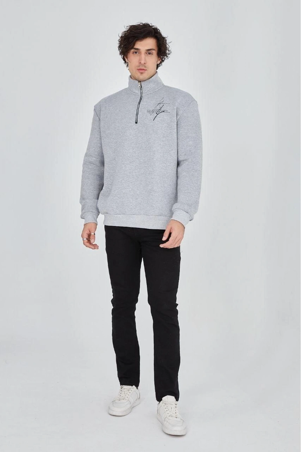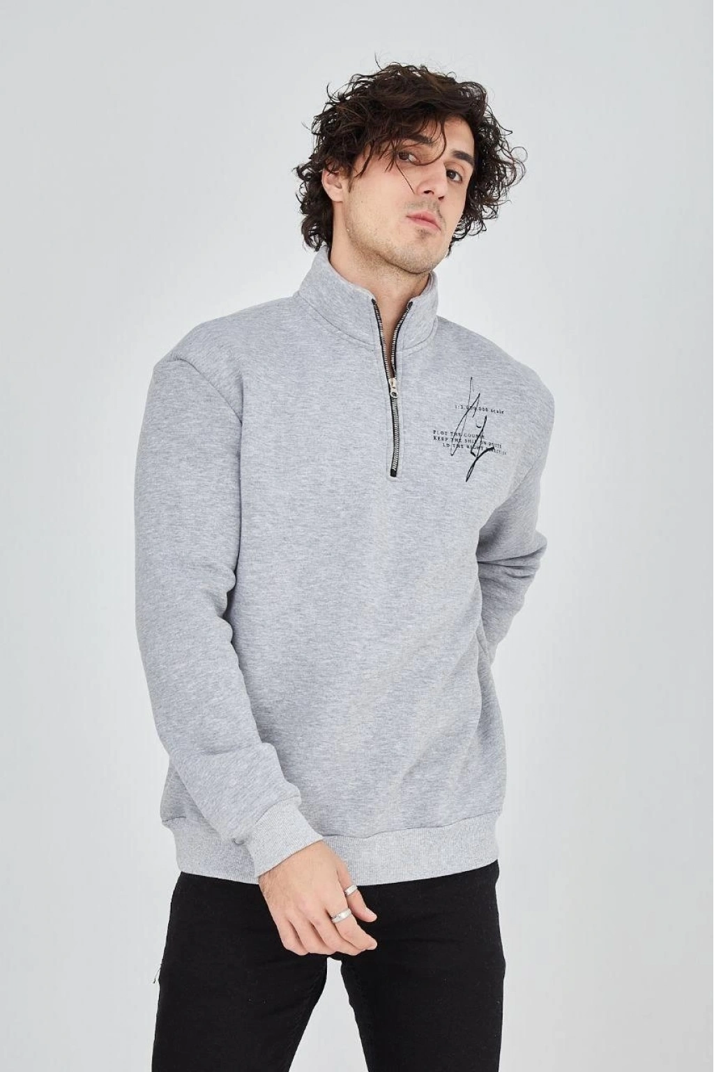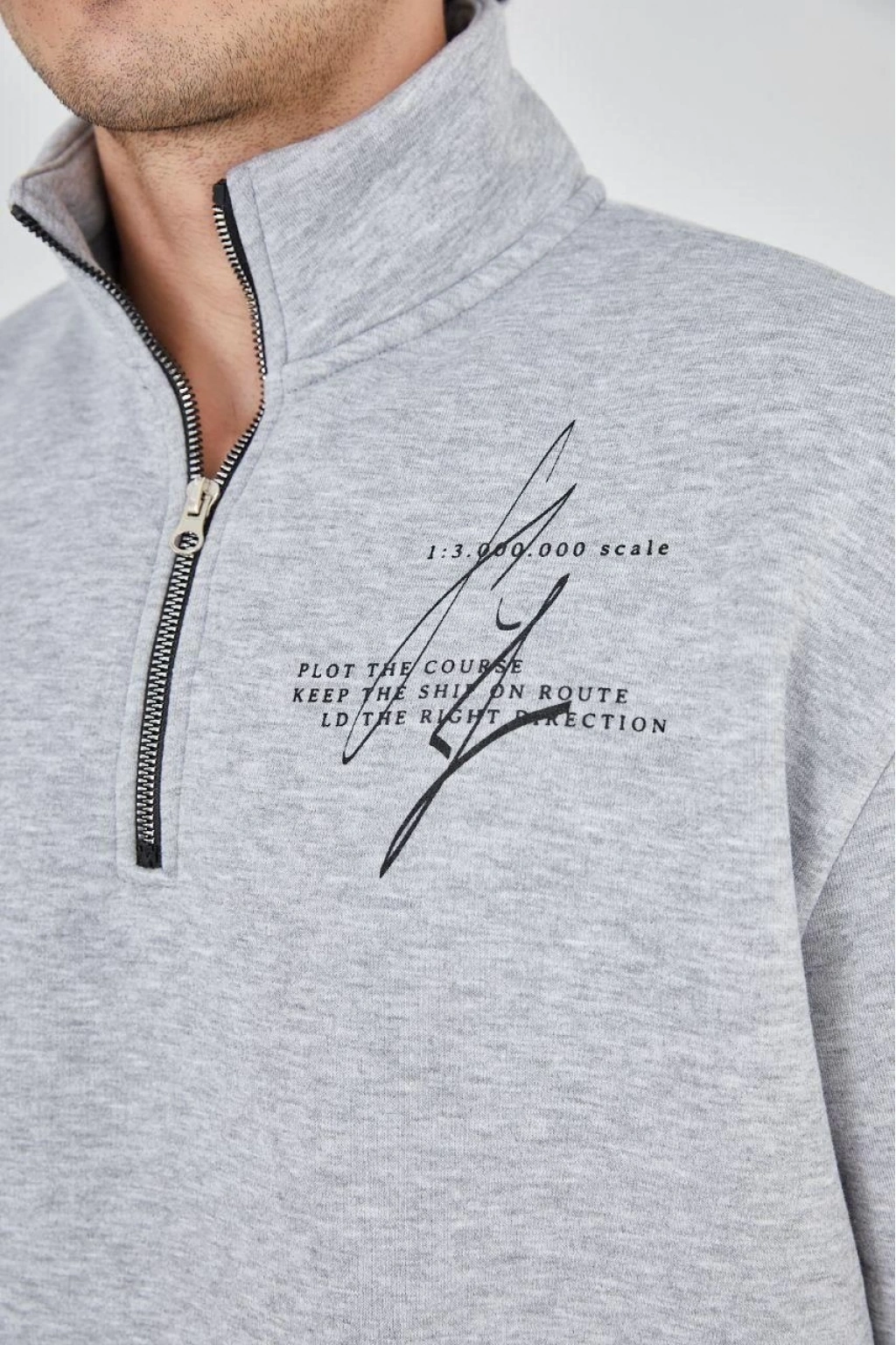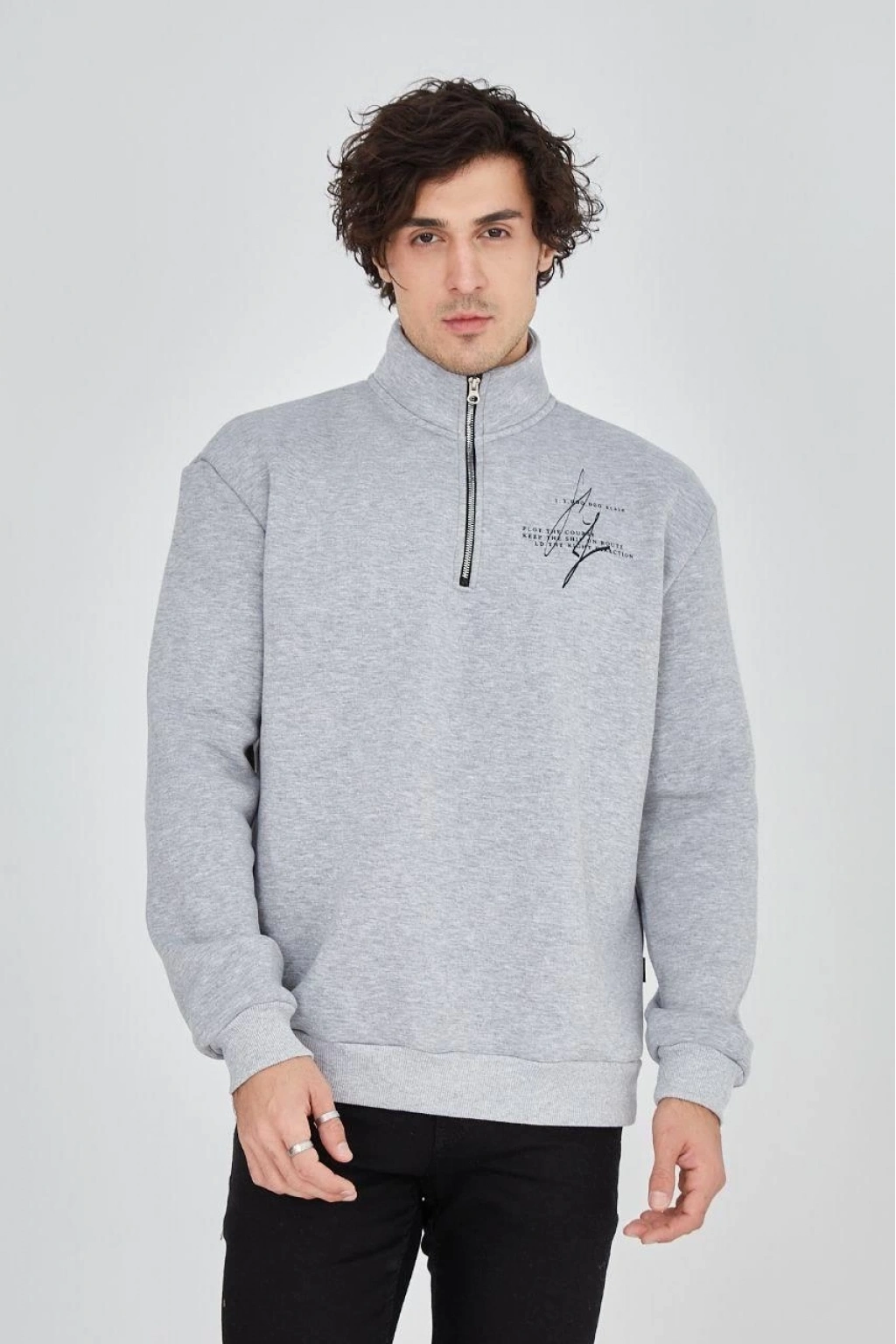Yarım Fermuarlı Baskılı Sweat - Gri -