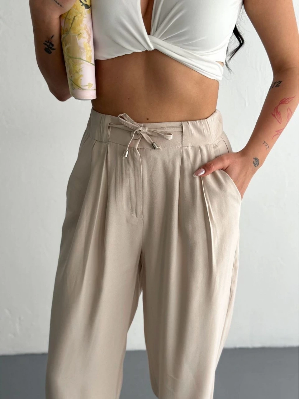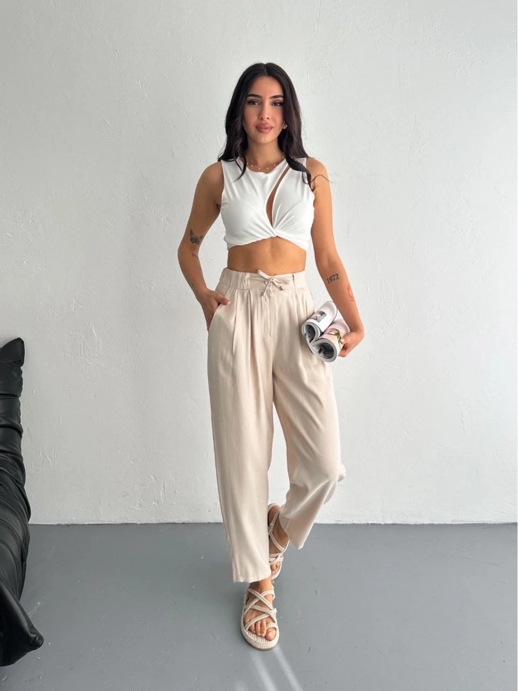 Yüksel Bel Beli Bağcıklı Rahat Boru Paça Pantalon - Kırık Beyaz -