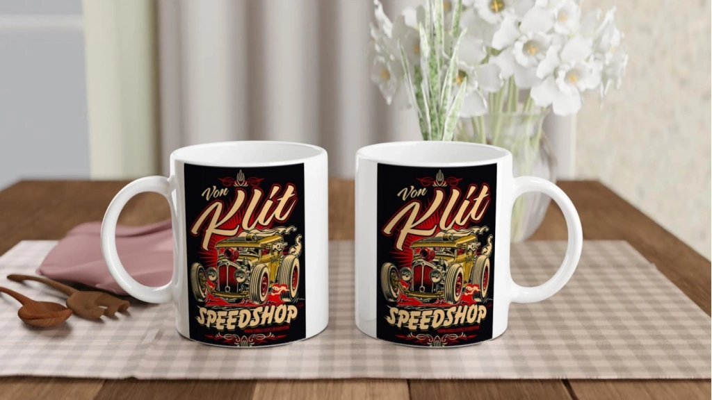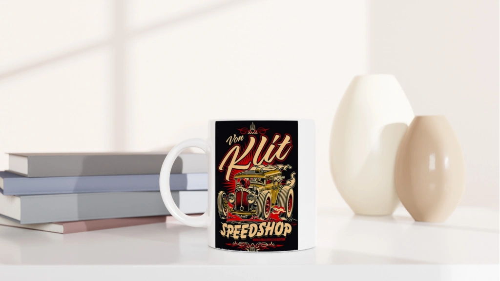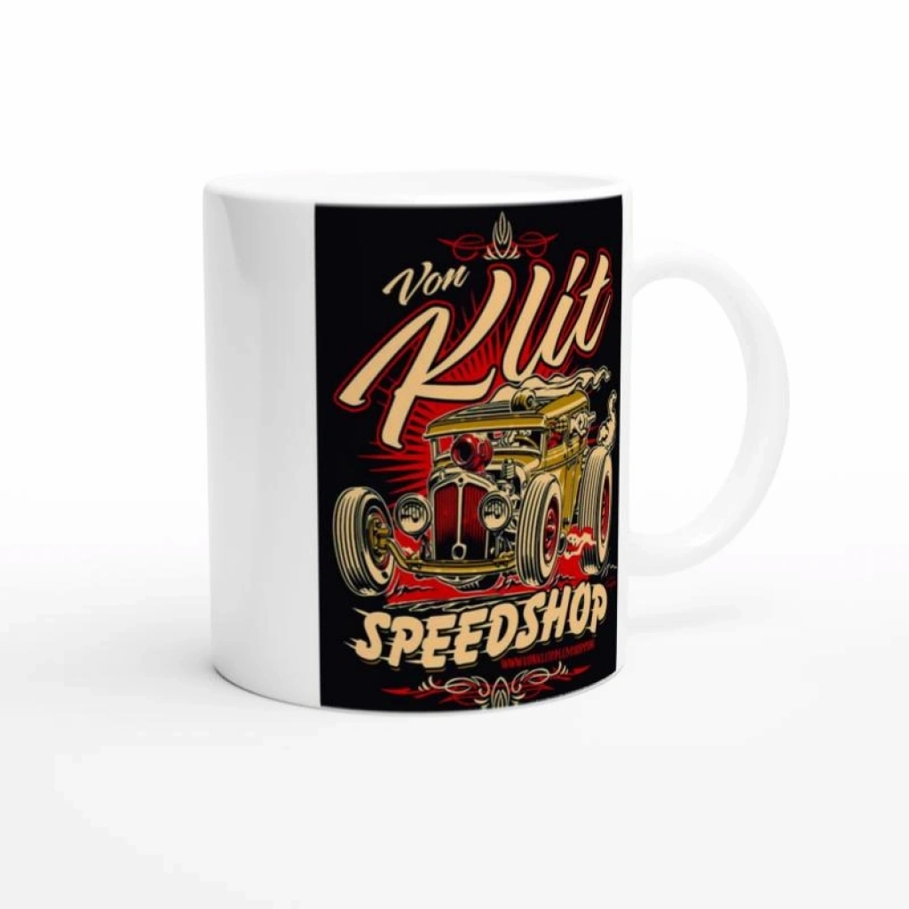 Von Klit Speedshop imzalı bu dinamik hot rod baskılı kupa bardak, vintage araba severler için mükemmel bir koleksiyon parçası.