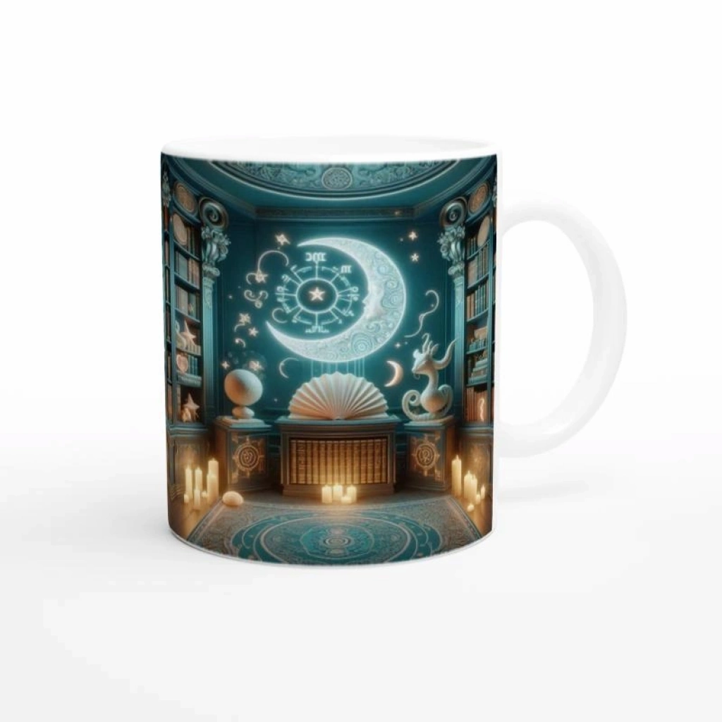 Duygusal derinliğiyle tanınan Yengeç burcuna özel bu Zodyak Kütüphanesi temalı kupa, yıldızlarla bezeli raflar arasında şefkatli bir bilgelik sunuyor. Her yudum bir içsel keşif!