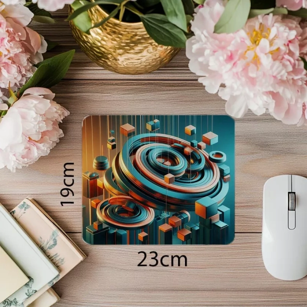 Yüzeyde yüzen halka ve silindir formlarıyla tasarlanan bu mouse pad, 3D etkisiyle modern ve özgün bir tarz yansıtır.