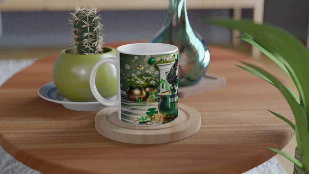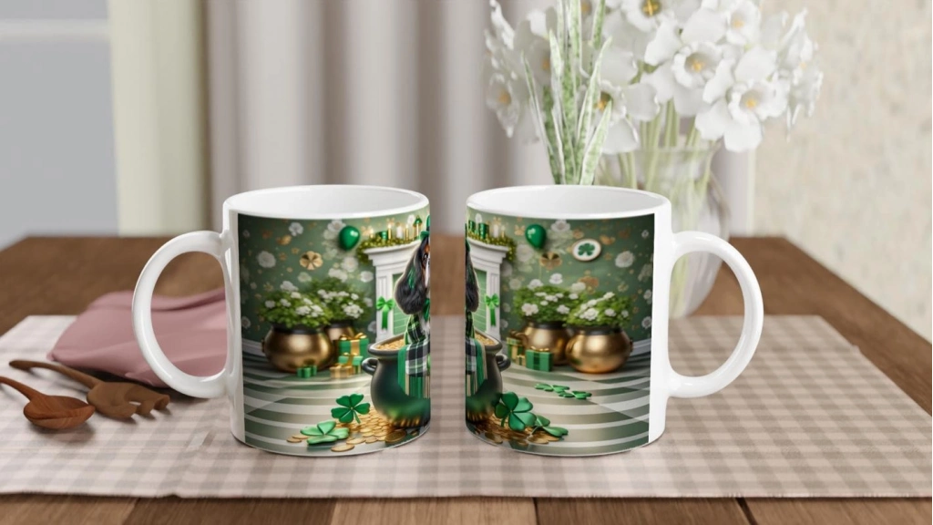 Şans Tenceresinden Bakan Cavalier King Charles Temalı Baskılı Kupa Bardak, minik şapkalı ve yeşil fularlı sevimli köpeğiyle hem nostaljik hem neşeli bir görünüm kazandırıyor. Altın sikkeler, yoncalar ve hediye kutuları arasında dikkat çeken bu tasarım, özellikle köpek severler için harika bir hediye alternatifi.