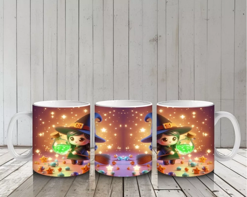 Sevimli cadı kız ve şeker sepeti figürüyle tasarlanan bu renkli kupa bardak, Cadılar Bayramı kutlamalarınıza neşeli bir hava katar.
