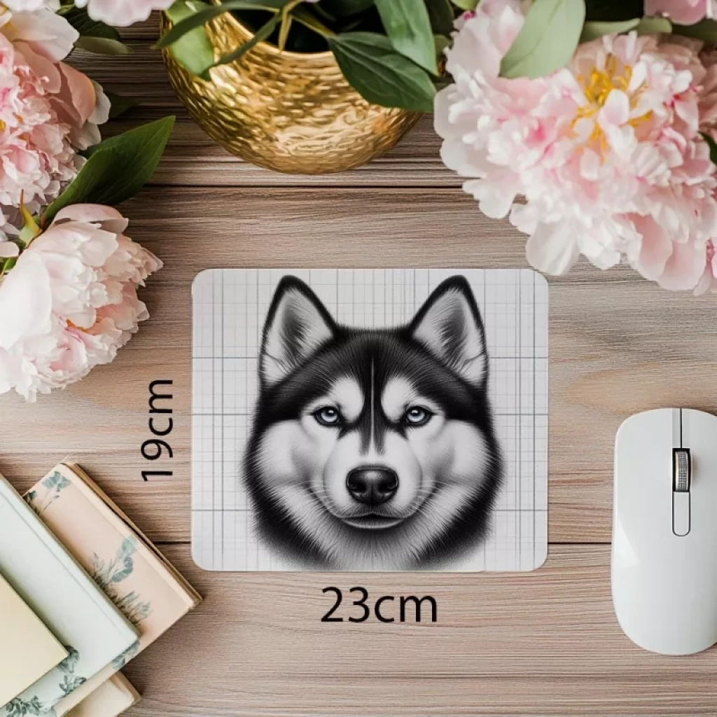 Karakalem stilde Siberian Husky illüstrasyonlu mousepad, yüksek hassasiyetli yüzeyi ve kaymaz alt yüzeyiyle uzun ömürlü ve şık bir deneyim sağlar.