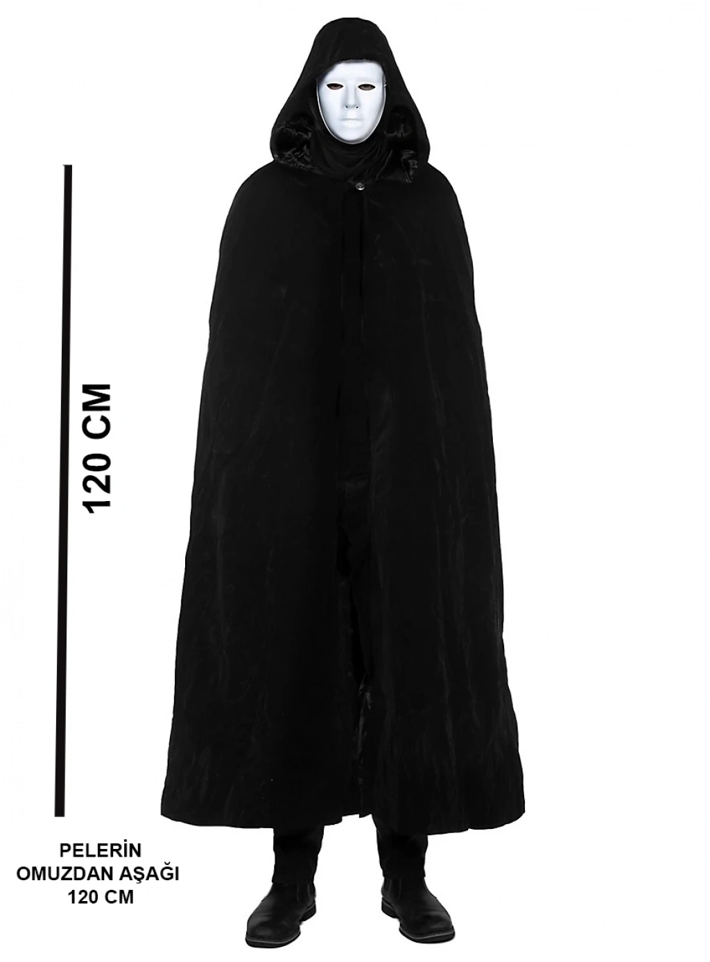 Pelerin omuzdan aşağıya 120 cm uzunluğundadır ve yetişkinler için uygundur. Maske tam yüz kapatacak şekilde tasarlanmış olup, dilerseniz akrilik boya veya kalemlerle kişisel tarzınıza göre boyayabilirsiniz.