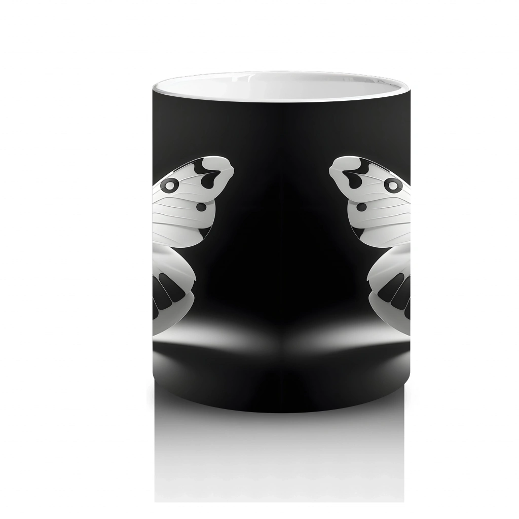 Siyah Zemin Üzerinde Ayna Yansımalı Beyaz Kelebek – Baskılı Kahve Kupası