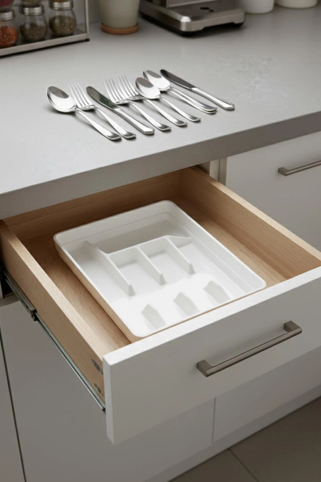 Soft beyaz rengi ve sade tasarımıyla mutfak çekmecelerinize şıklık kazandıran bu akrilik raf içi kaşıklık, çatal bıçak takımınızı düzenli tutmanızı sağlar. Günlük kullanımda kolay temizlik ve hijyen sunar.