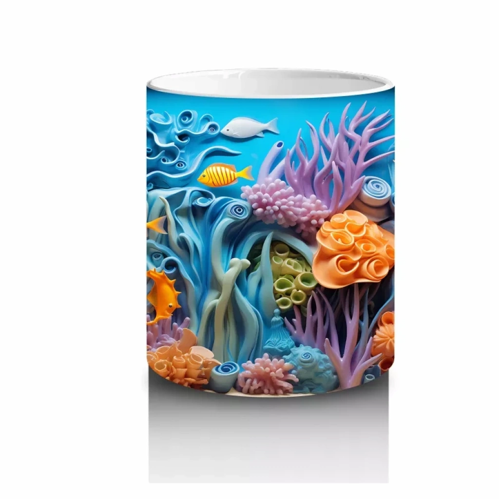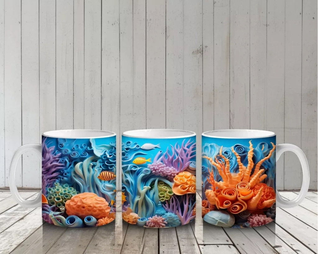 Tropik bir sualtı şöleni! ?? Mercanlar ve rengârenk balıklarla bezeli bu canlı tasarım, her sabah kahve keyfinizi adeta bir tatil havasına dönüştürecek.