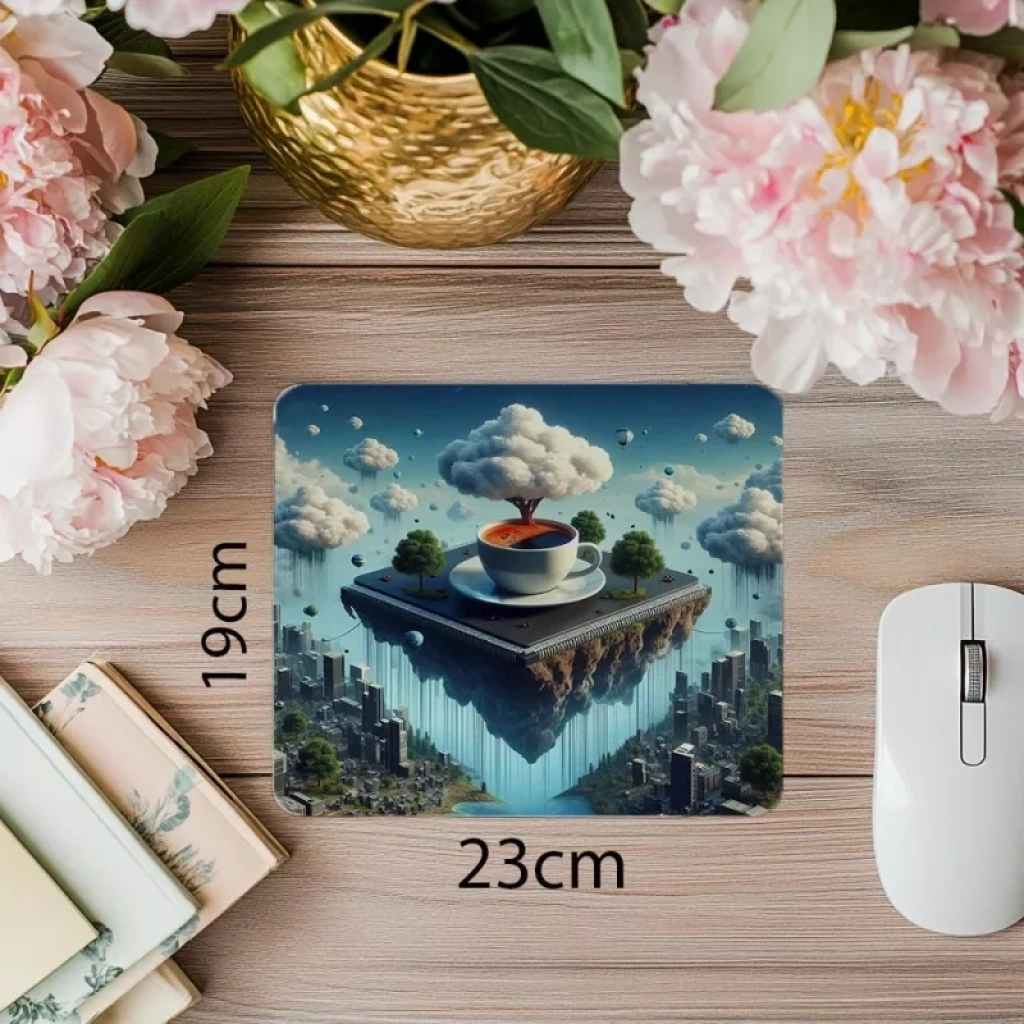 Gerçeküstü detaylarla bezeli bu “Yazılımcı Cenneti” mouse pad tasarımı, kod dünyasını hayal gücüyle buluşturur. Bulutların, kahve fincanlarının ve uçuşan kodların iç içe geçtiği bu sahne, yaratıcı zihinler için ilham verici bir alan sunar.