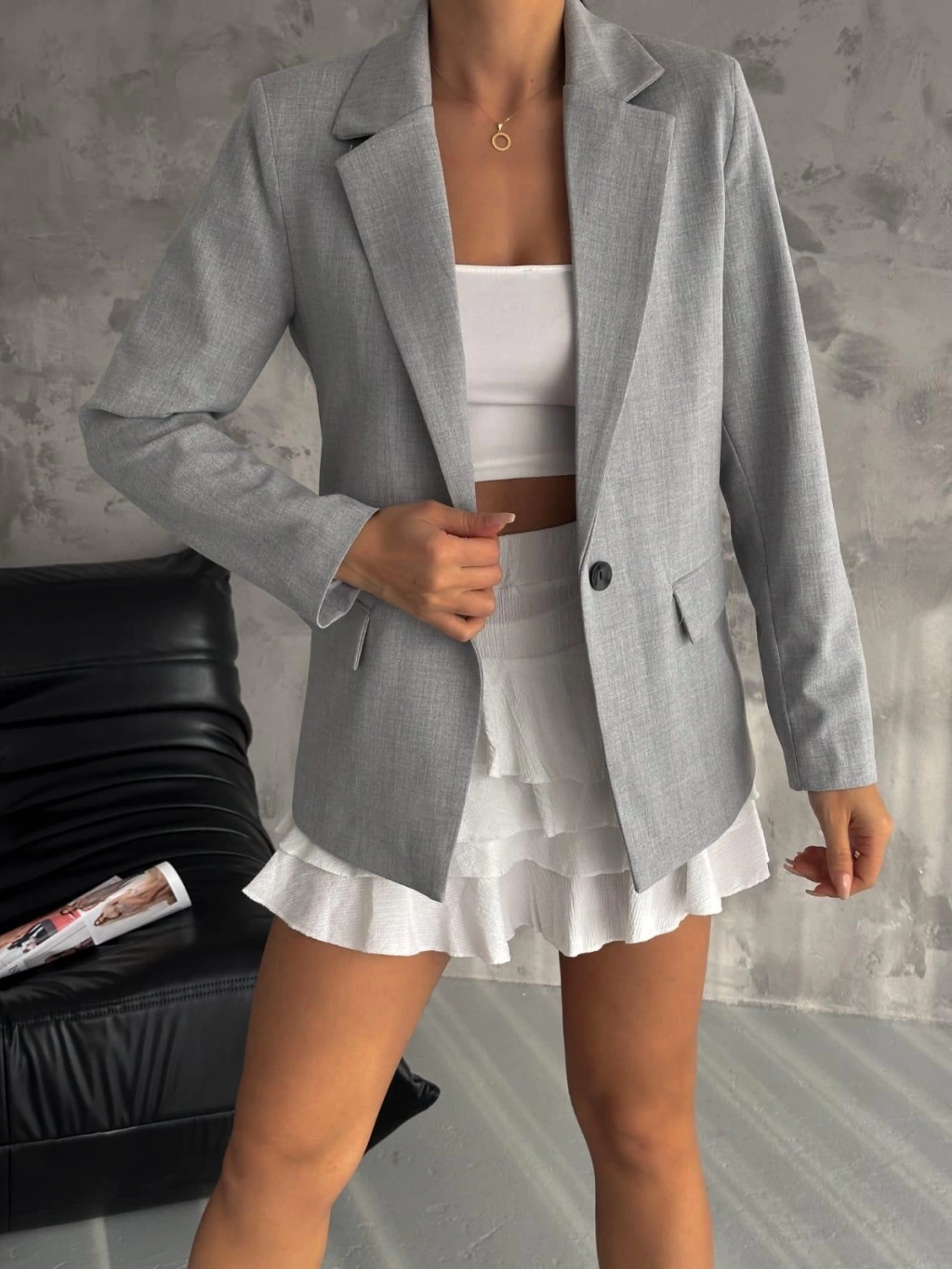 Modern stilin zarif tamamlayıcısı! Kadın tek düğmeli poliviskon ceket modeli, hem şık hem rahat tasarımıyla günlük kullanımda ve ofis kombinlerinde fark yaratır. Kolay ütülenen kumaşı ve vücuda oturan kesimiyle gardırobunuzun yıldız parçası olmaya aday.