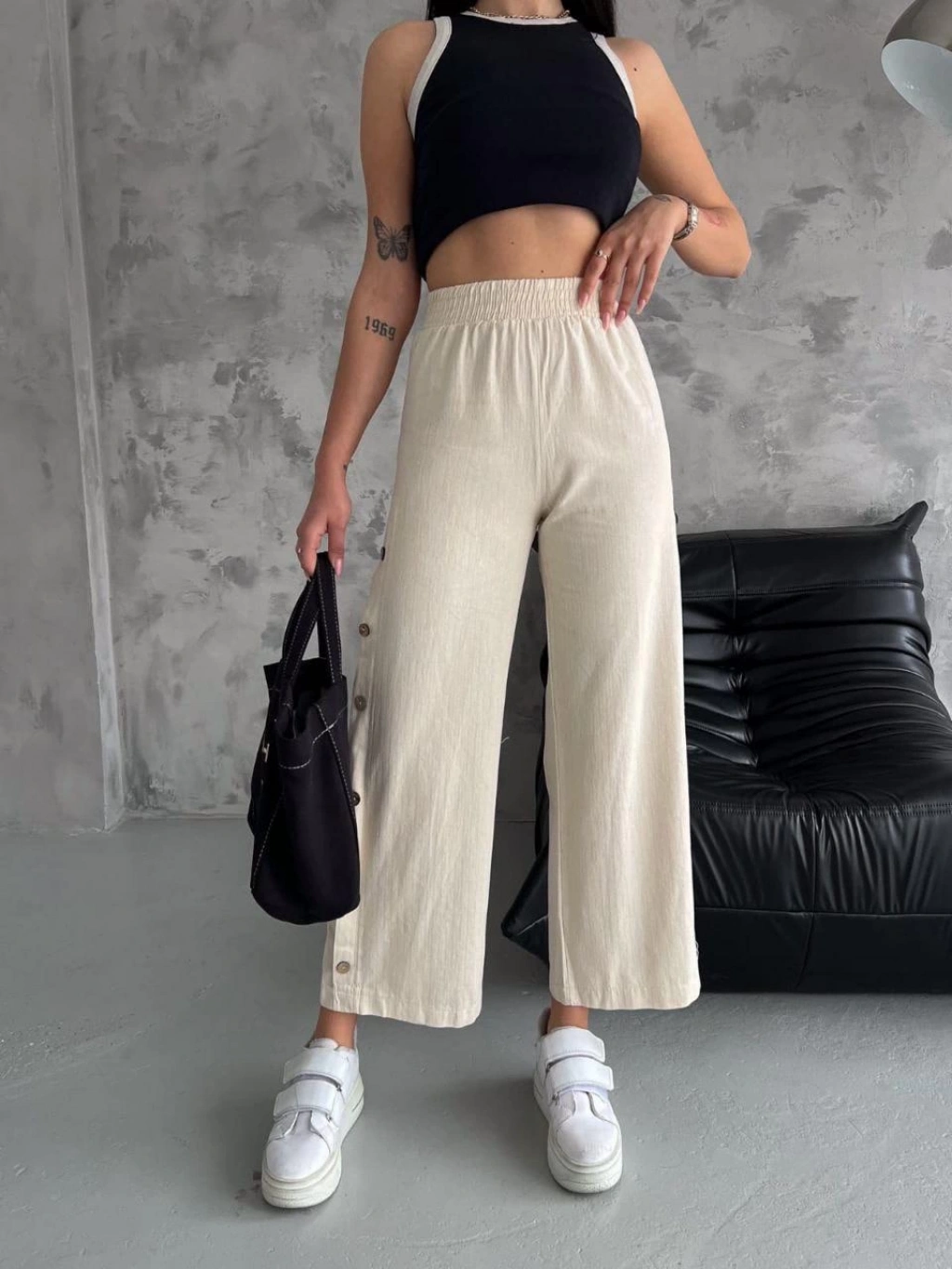 Rahatlığın ve şıklığın birleştiği yazlık pantolon modeli!Yan kısmındaki dekoratif düğmelerle modern bir görünüm sunan bu bol paça pantolon, nefes alabilen kumaşı ve lastikli beli sayesinde gün boyu konfor sağlar. Gömlek, crop veya basic tişörtlerle kolayca kombinlenebilir. Plajdan şehir stiline kadar geniş bir kullanım alanına sahip, gardırobunuzun favorisi olmaya aday bir parça!