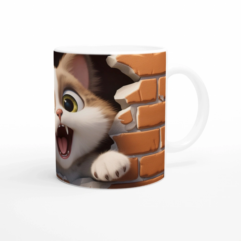 Tuğla Duvarı Yaran Oyuncu Kedi Temalı Baskılı Kupa Bardak, kırılmış tuğla duvarın arasından çıkıveren meraklı ve enerjik kedi figürüyle dikkat çekiyor. Sevimliliğiyle gülümseten bu tasarım, kedi severlerin favorisi olacak.