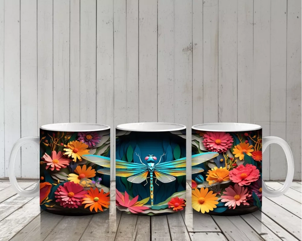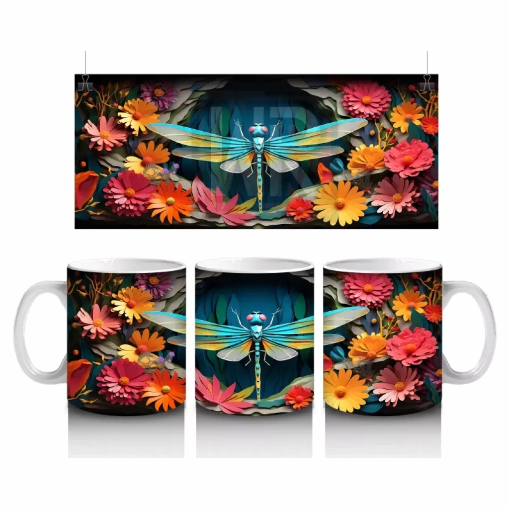 Turuncu çiçeklerin canlılığıyla çevrelenmiş mavi yusufçuk, doğanın zarif dansını bu tasarıma taşıyor. Sade ve etkileyici çizgilerle hazırlanmış, huzur veren bir kupa modeli.