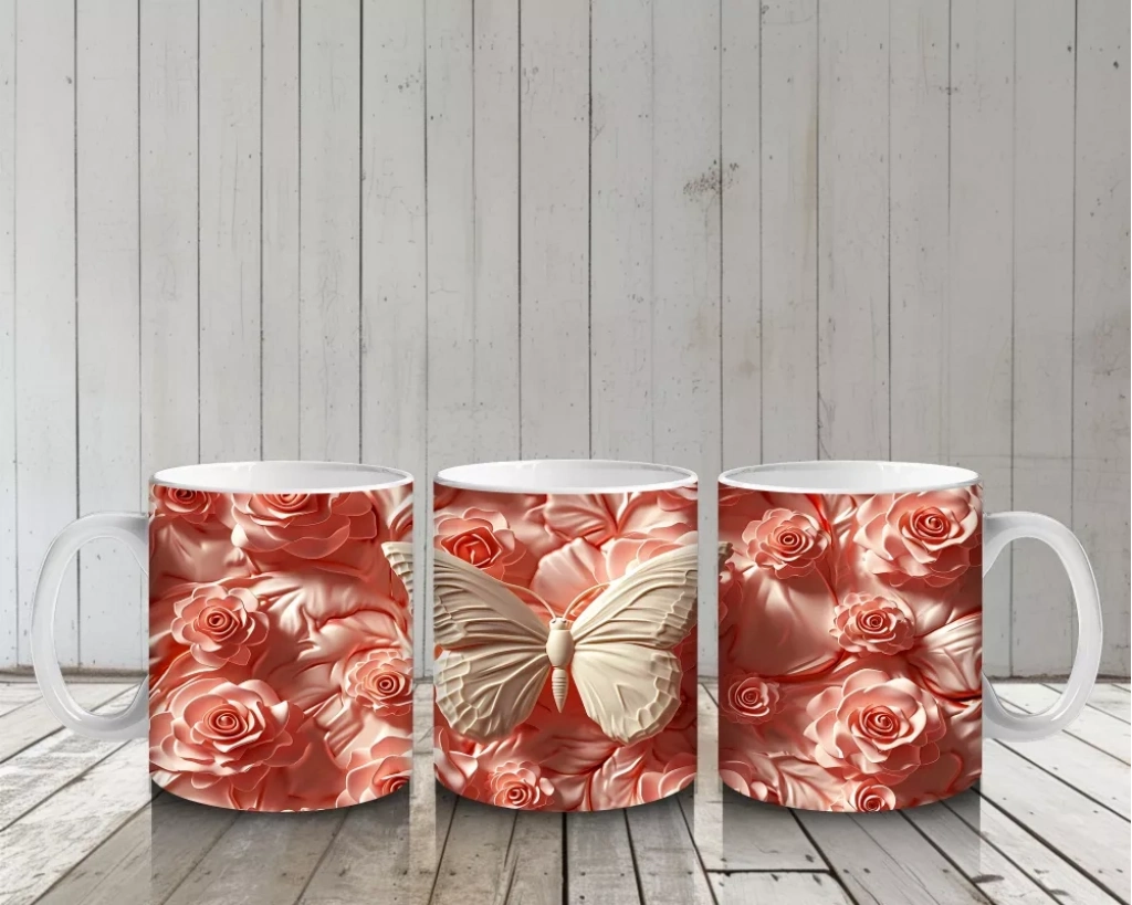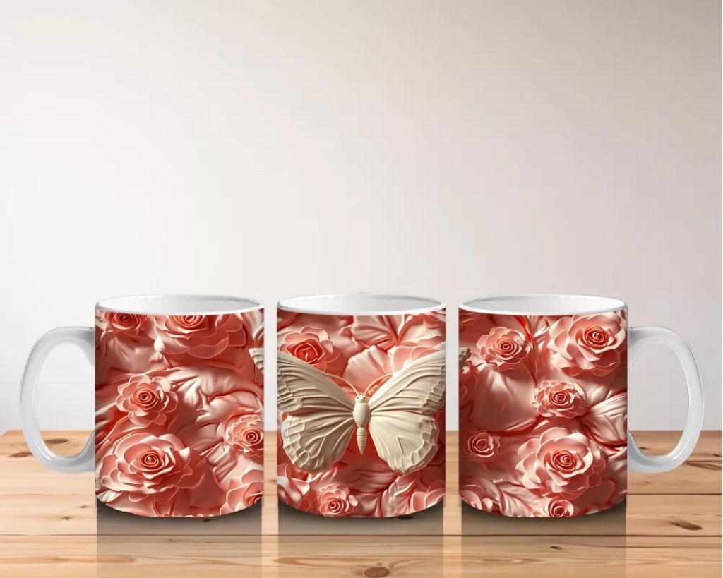 Turuncu Rölyef Çiçekler Arasında Krem Renkli Kelebek – Baskılı Kahve Kupası