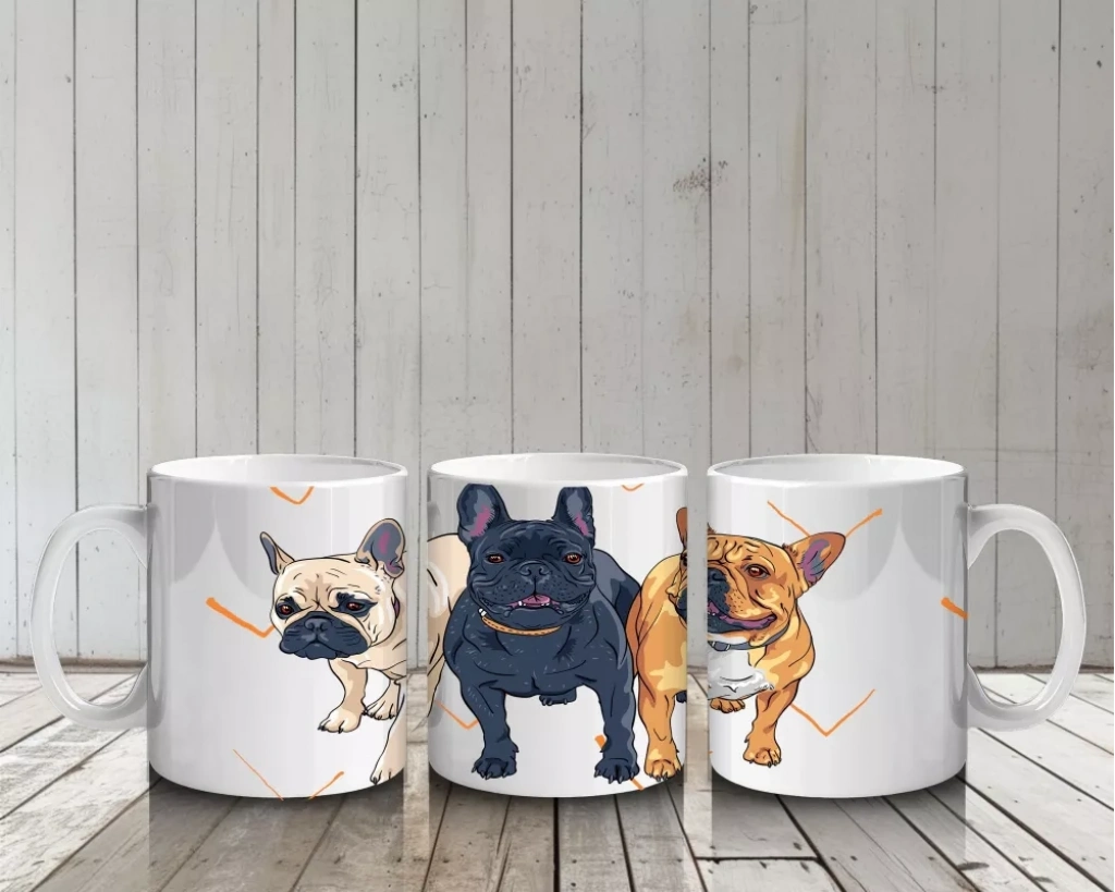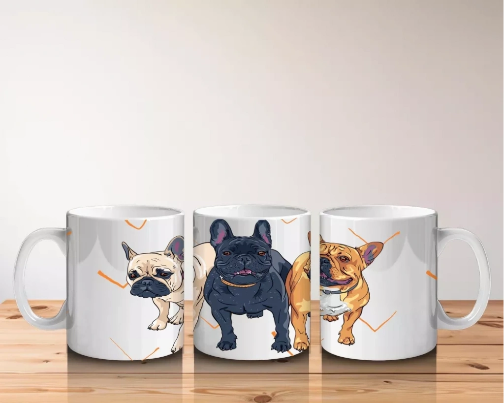 Üç Sevimli Bulldog Karakteri İllüstrasyonu – Baskılı Kahve Kupası
