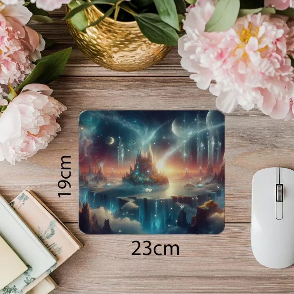 Adalar ve şelalelerle süslenmiş uzay manzaralı bu mouse pad, fantastik evrenlerde geçen bir yolculuk hissi uyandırır.
