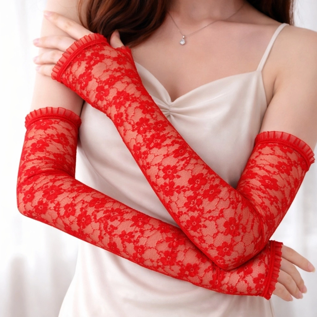 Uzun Zarif Dantel Eldiven Parmaksız Kırmızı 35 Cm
