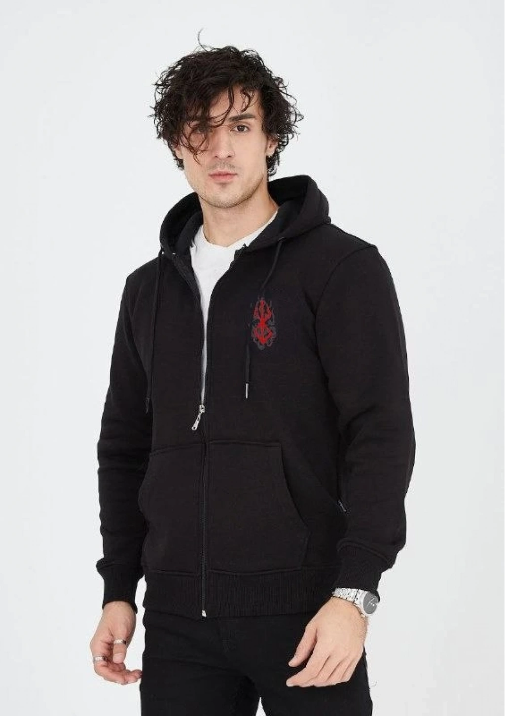 Baskılı Tam Fermuarlı Kapşonlu SweatShirt - Siyah -