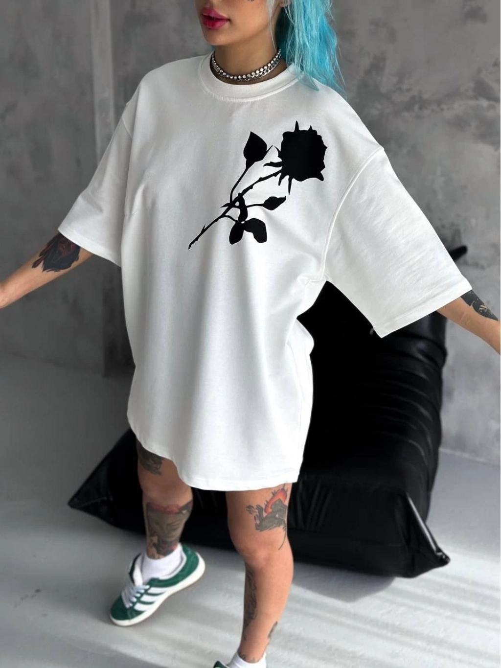 Bisiklet Yaka Baskılı Oversize T-Shirt - Beyaz -
