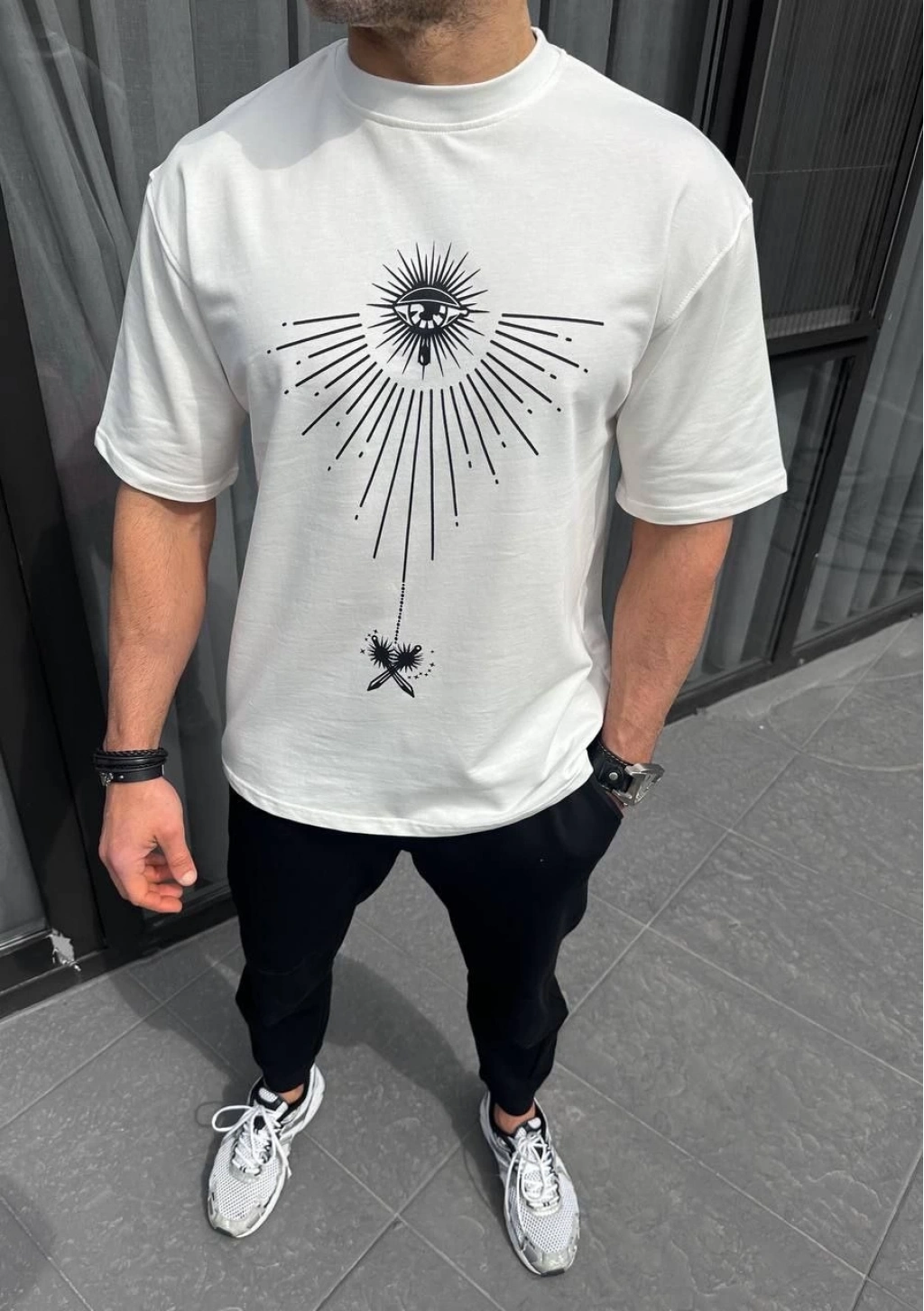 Bisiklet Yaka Baskılı Oversize T-Shirt - Beyaz -