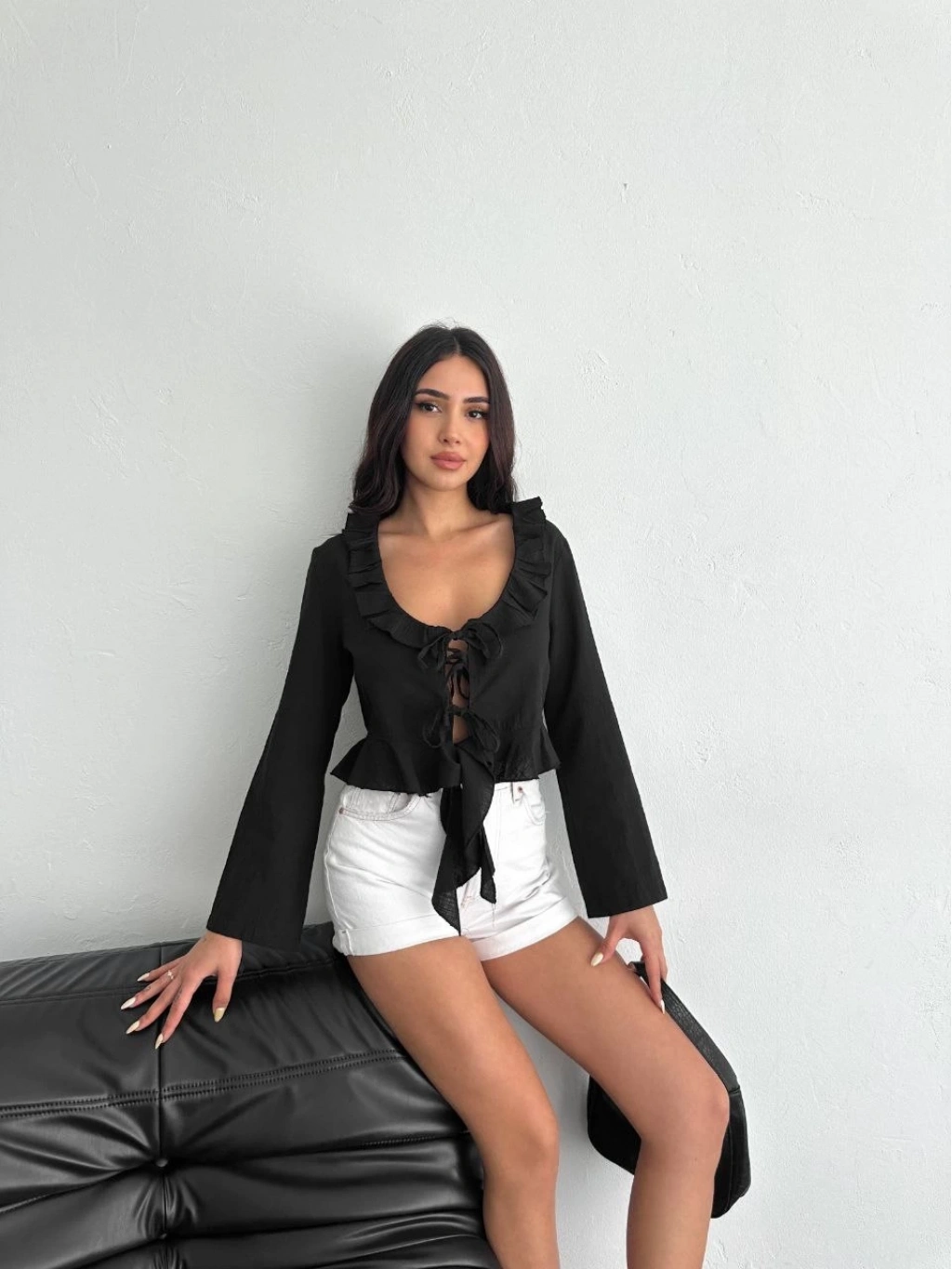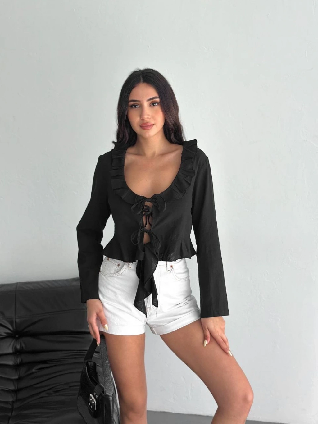 Keten Uzun Kol Bağacık Detaylı Bluz - Siyah -