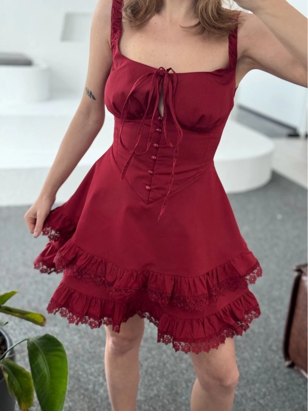 Mini Askılı Elbise - Bordo -