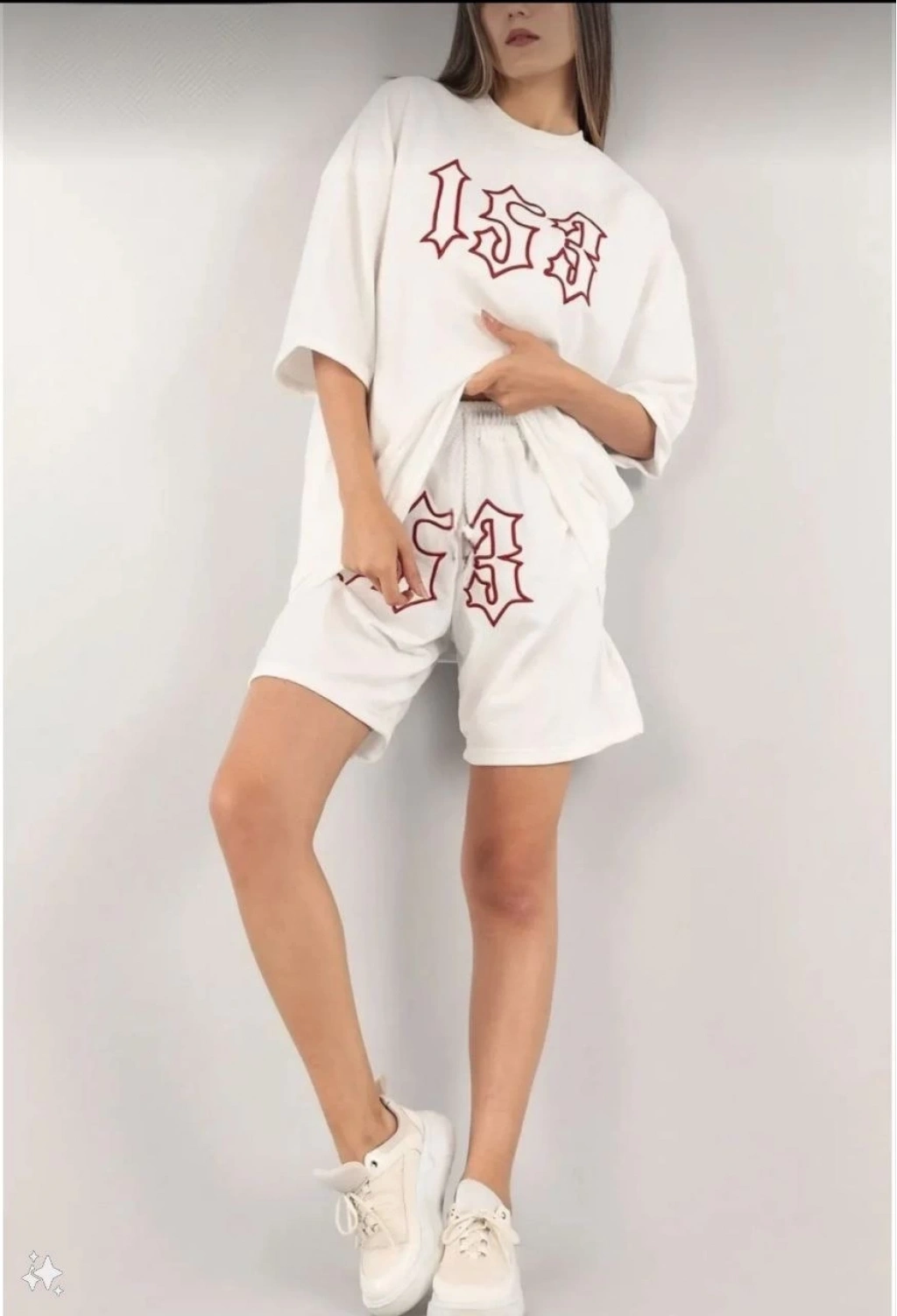 Nakış İşlemeli Şort Takım - Beyaz -