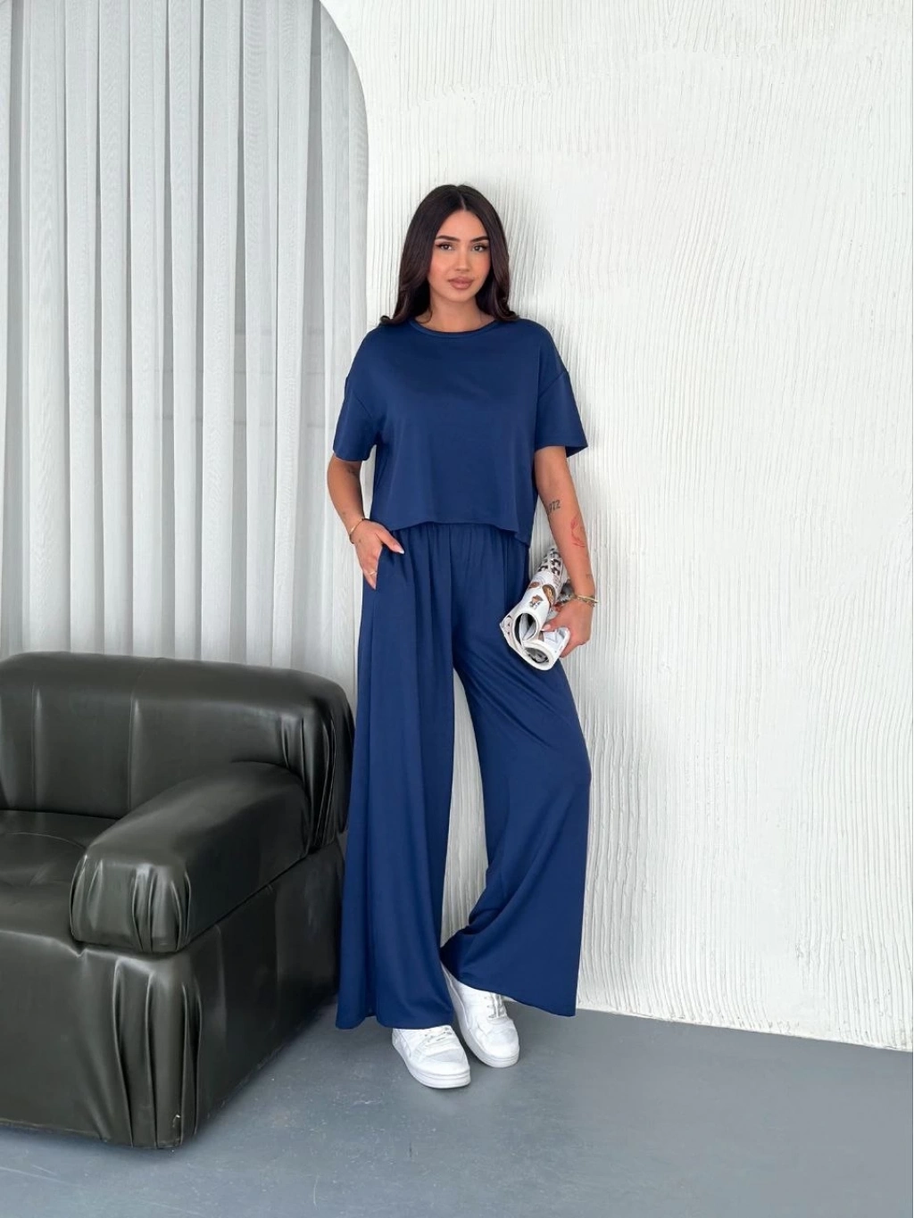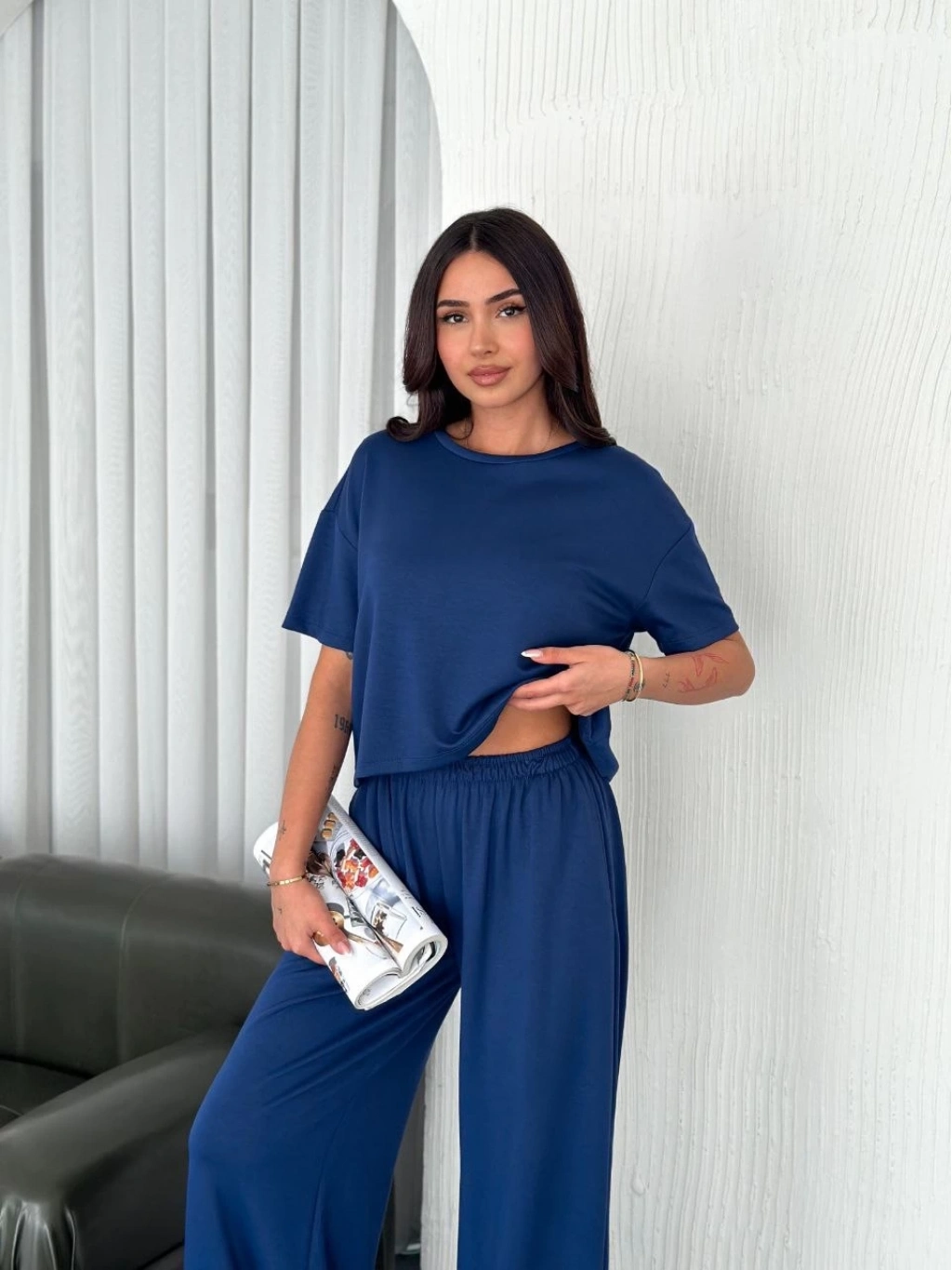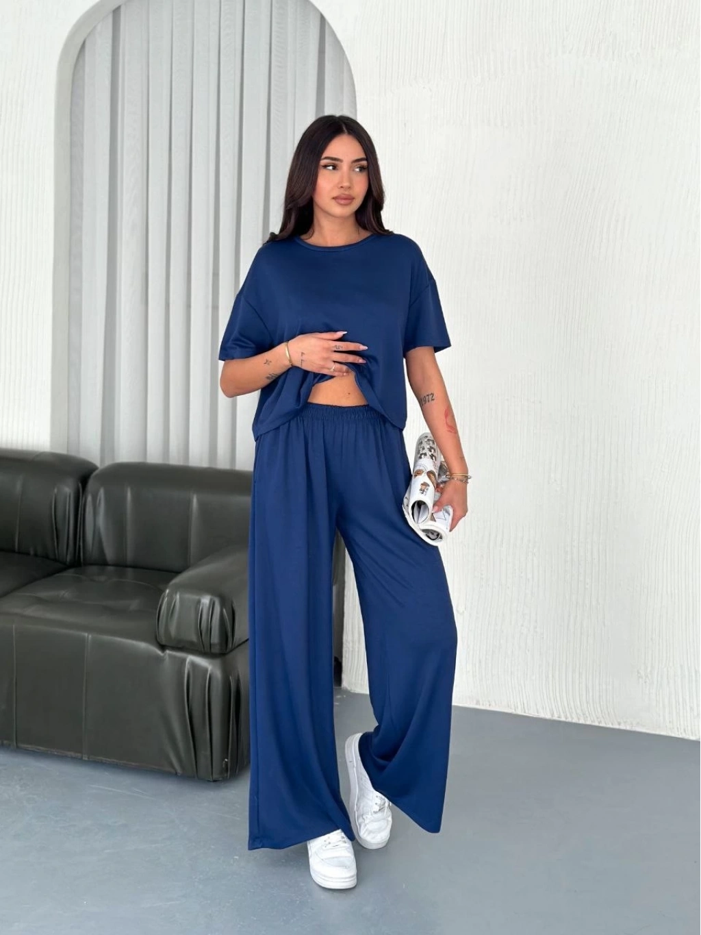 Osy Modal Yumuşak Dokulu Kumaş Bisiklet Yaka T-shirt Bol paça Pantalon ikili Takım -Saks Mavi -