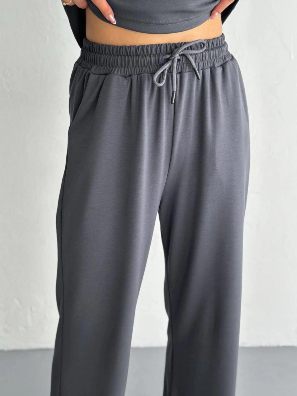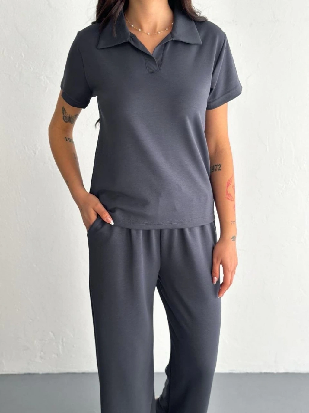 Osy Modal Yumuşak Dokulu Kumaş Kısa Kollu Yakalı T-shirt Pantalon ikili Takım- Antrasit -
