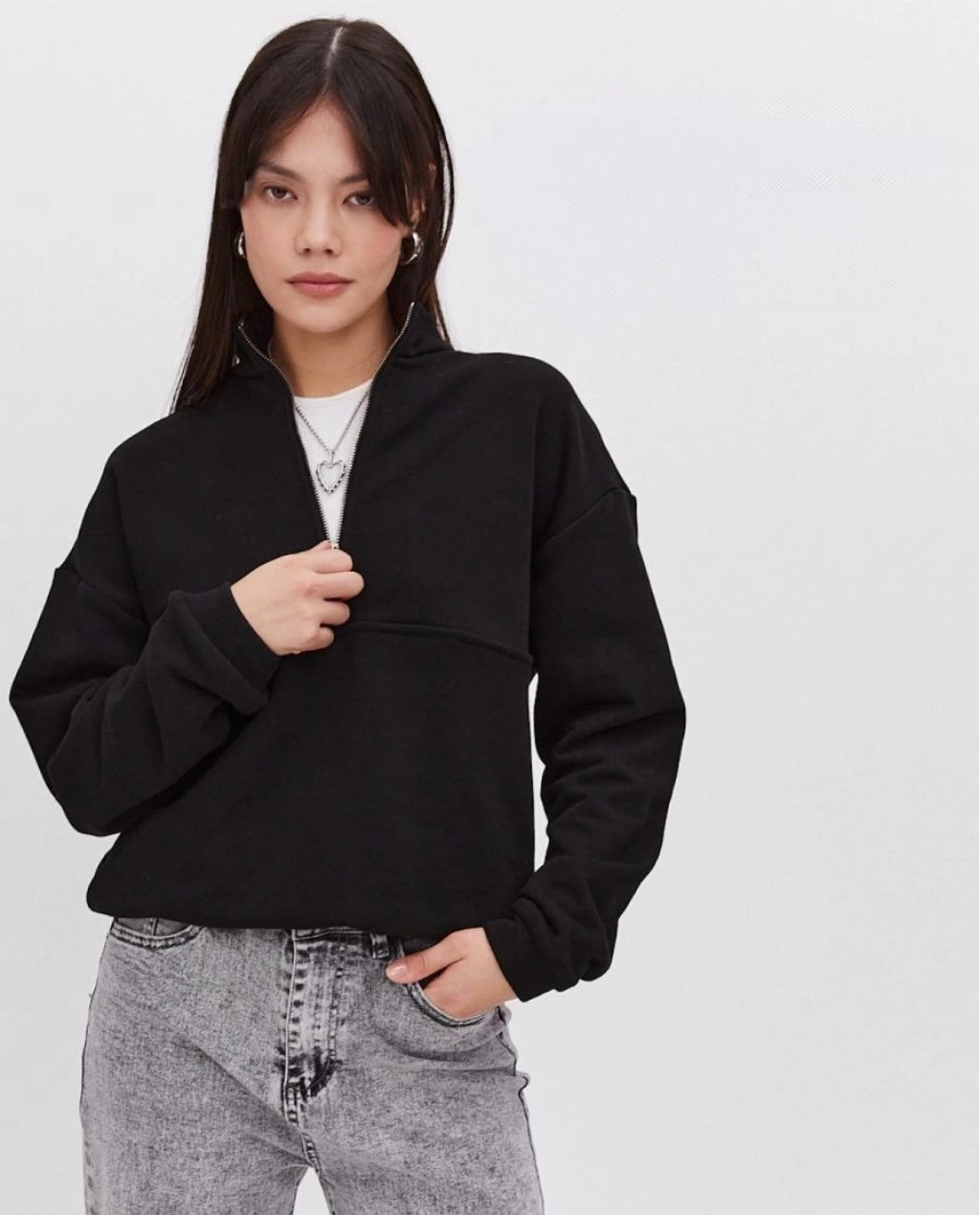 Oversize Yarım Farmuarlı Yakalı Basic SweatShirt - Siyah -