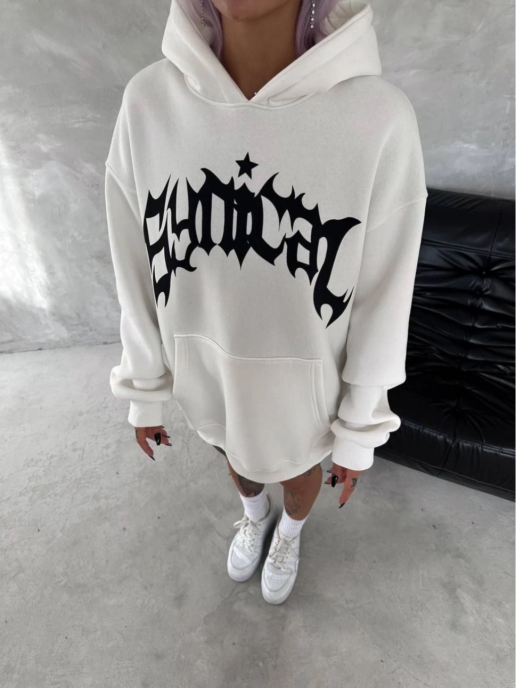 Üç İplik Kapüşonlu Baskılı SweatShirt - Beyaz -