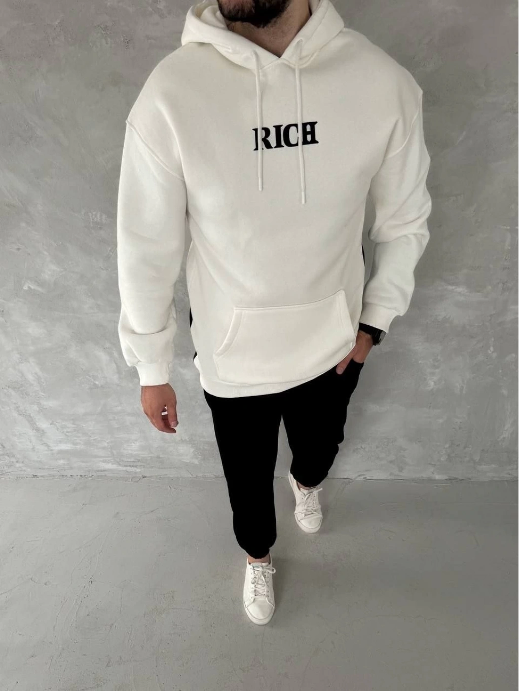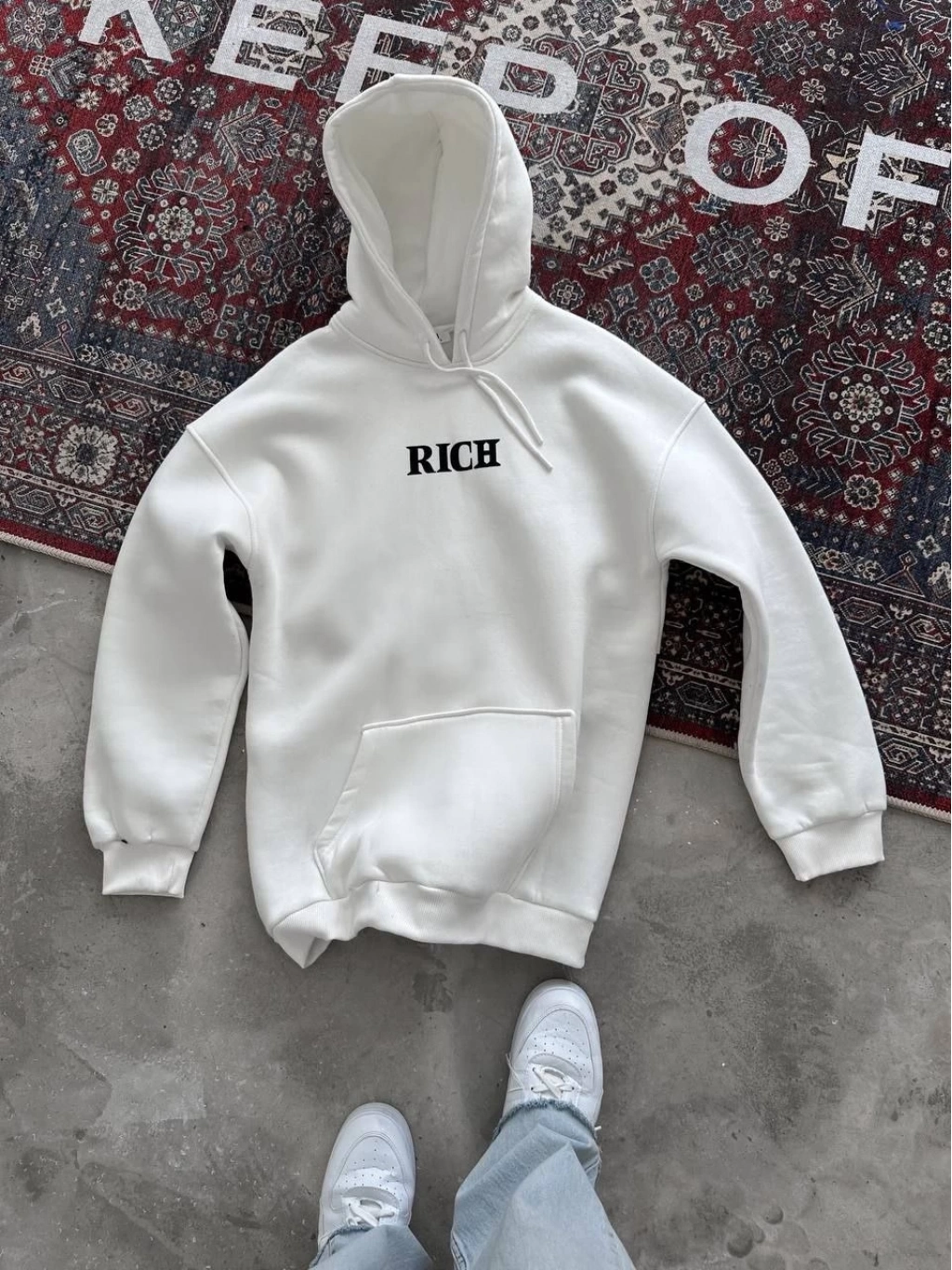 Uzun Kol Kapüşonlu Göğüs Baskılı SweatShirt - Beyaz -