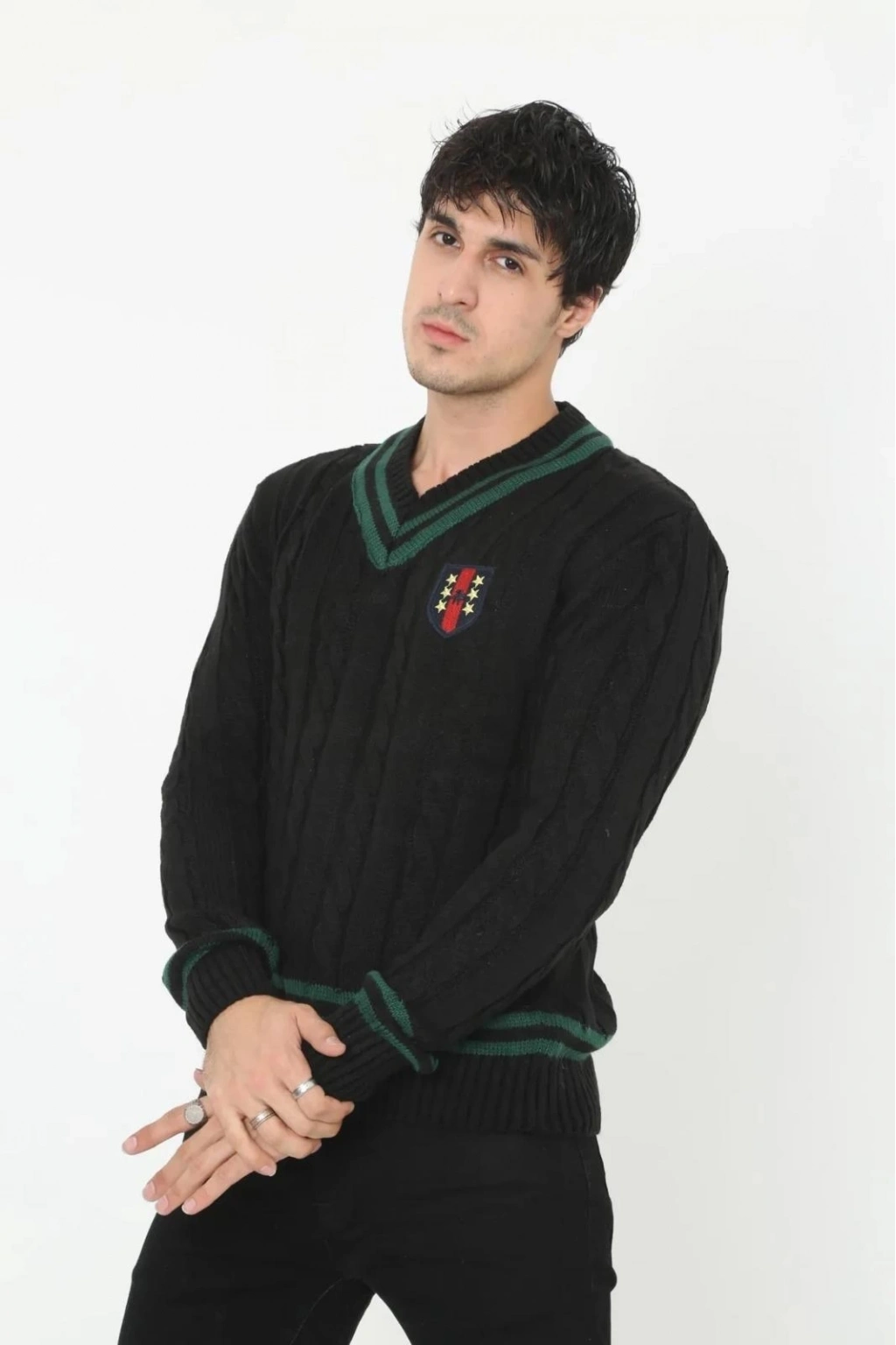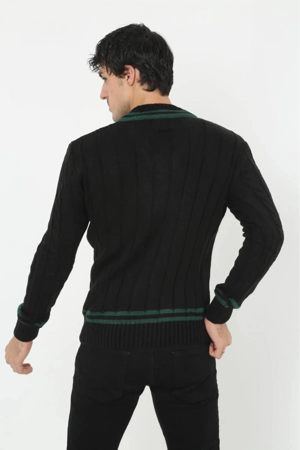V Yaka Örgülü Kazak - Siyah -