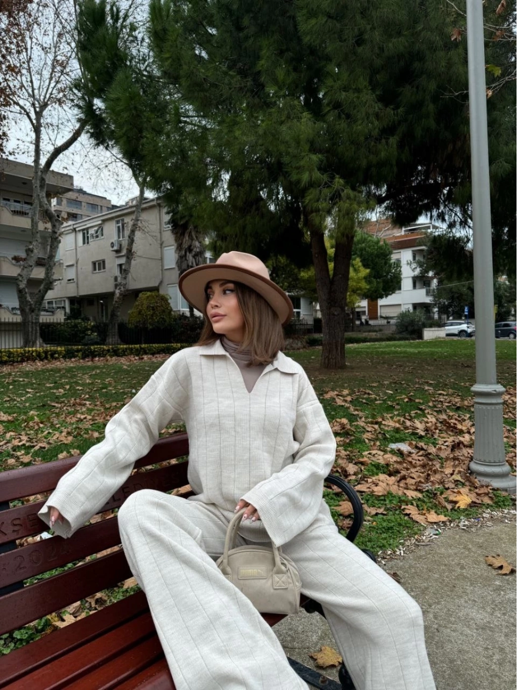 Yakalı Cizgi Detaylı Triko İkili Takım - Beyaz -
