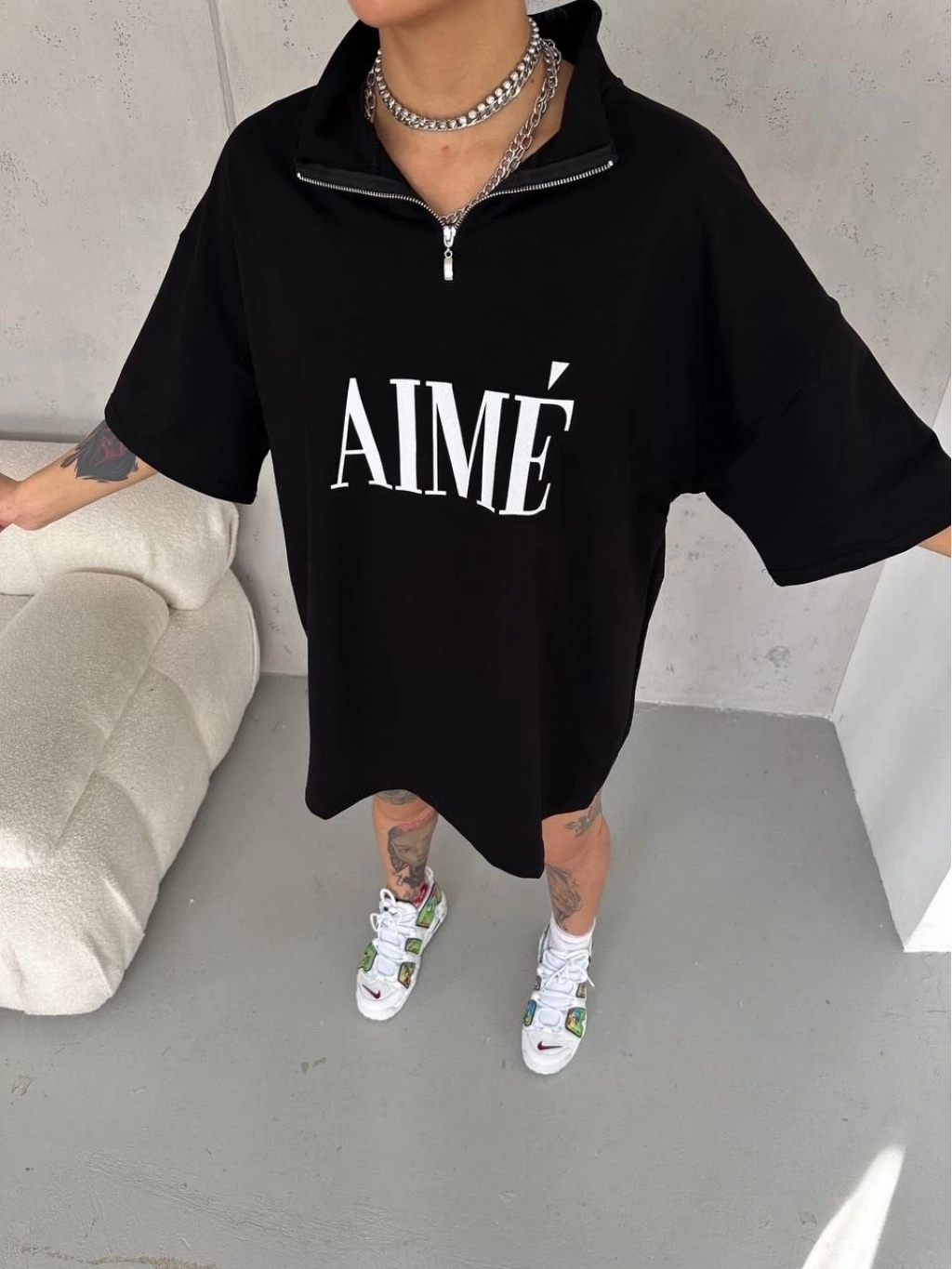 Yarım Fermuarlı Baskılı T-Shirt - Siyah -