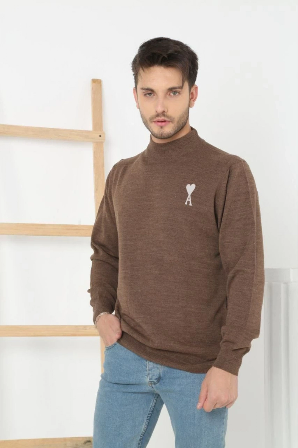 Yarım Boğazlı Baskılı Dokuma Triko - Kahve
