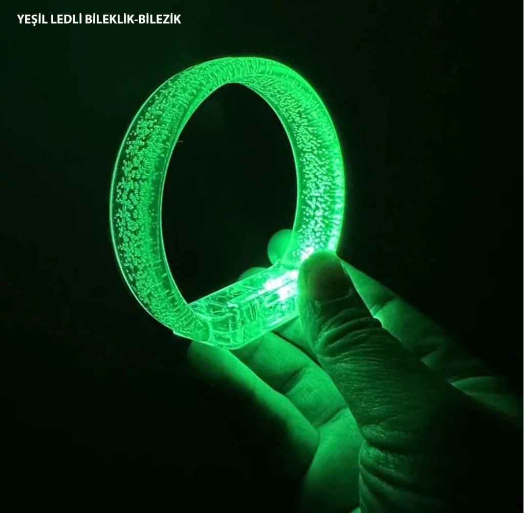 Yeşil LED ışıklı bileklik şeffaf yapısı ve içindeki mikro kabarcıklarla ortamı anında renklendirir. Hem çocuklar hem yetişkinler için uygun olan bu ürün 3 adet AG13 pil ile çalışır ve pilleri dahildir. Doğum günü, konser, etkinlik ve festivallerde fark yaratır.