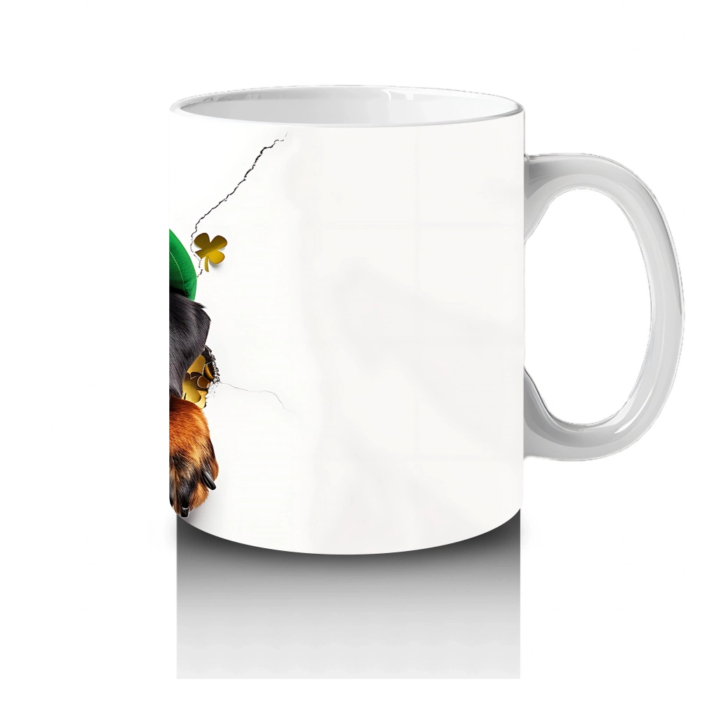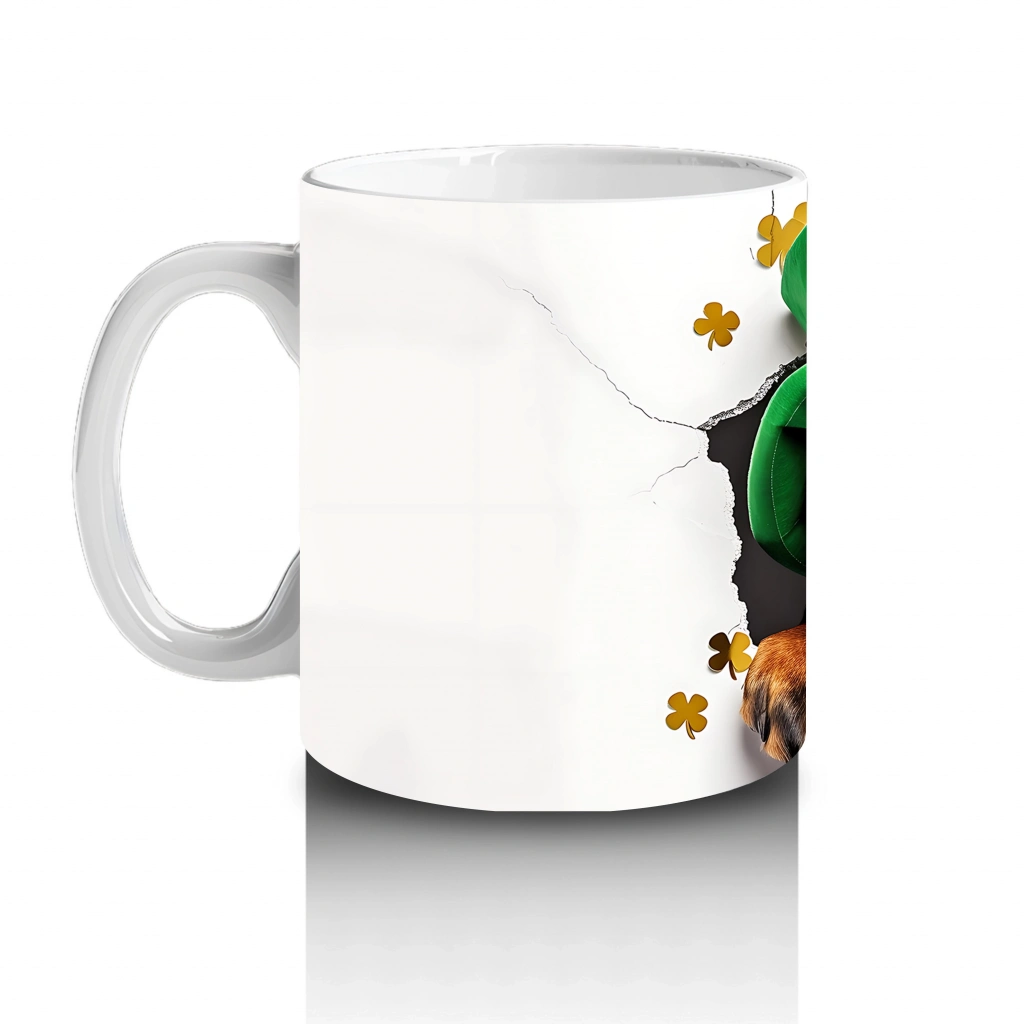 Yeşil St. Patrick şapkasıyla tamamlanan bu neşeli köpek maskot, enerjik görünümüyle yüzleri gülümsetiyor. Kutlama temalı tasarımlardan hoşlananlar için eğlenceli bir kupa alternatifi.