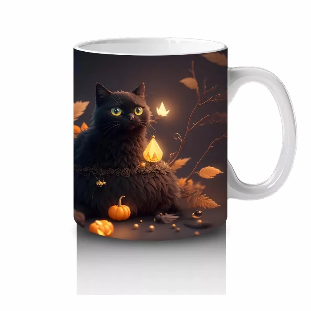 Renkli yılbaşı ışıkları arasında süzülen siyah kediler, hem gizemli hem de kutlama havasında bir görüntü sergiliyor. Yeni yıl ruhunu taşıyan eğlenceli ve estetik bir kupa tasarımı.