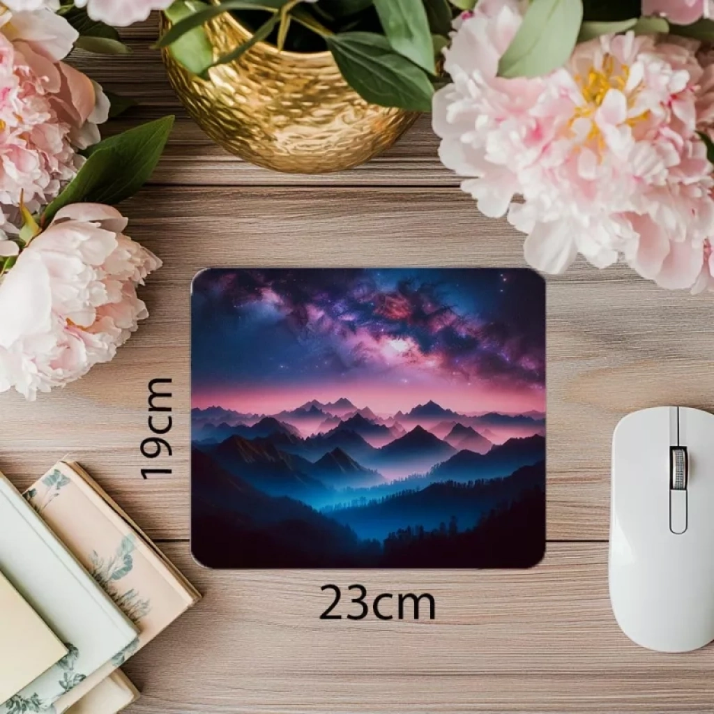 Yıldızlarla kaplı gece göğü ve dağ silüetiyle tasarlanan bu mousepad, huzurlu bir doğa ve uzay birleşimi sunar.