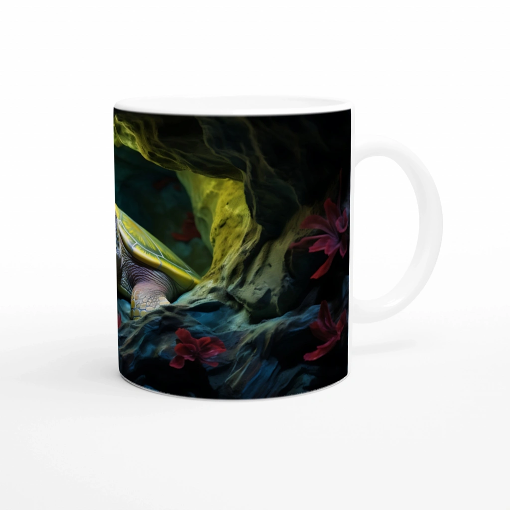 Işıkla aydınlanan mağara içinde dinlenen bu sevimli kaplumbağalı kupa bardak, su altının dinginliğini yaşam alanınıza taşıyor.